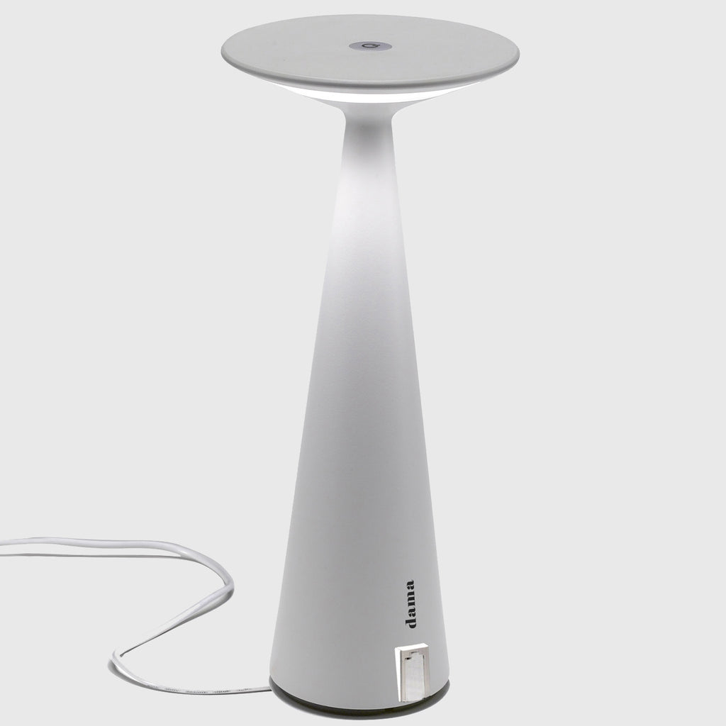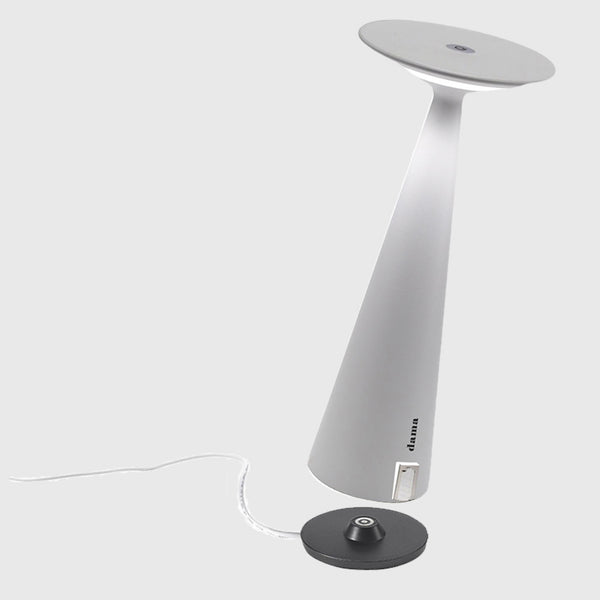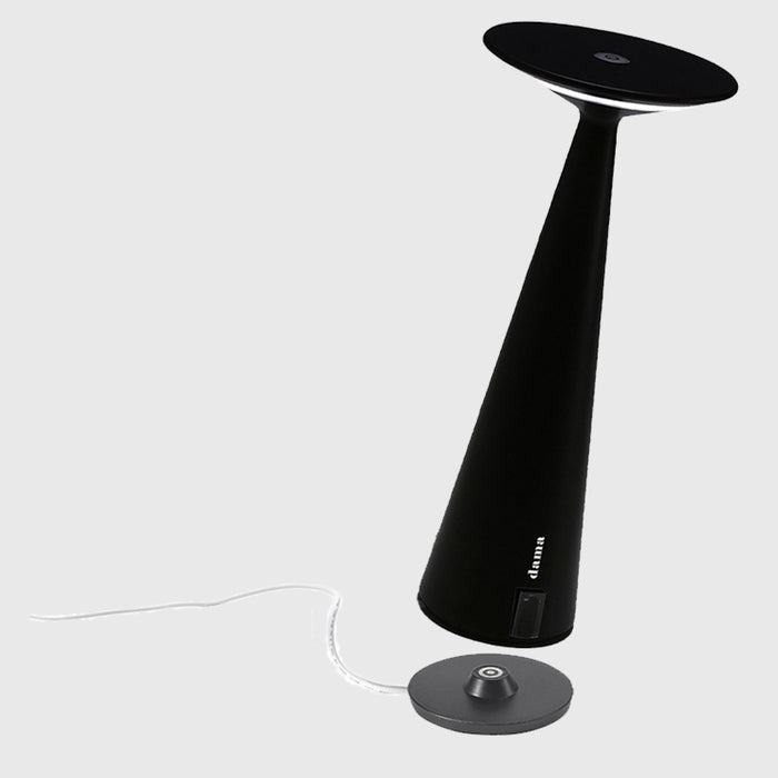 Dama Table Lamp by Zafferano Ai Lati Lights is a battery-operated, portable and rechargeable table lamp. It is equipped with a contact charging base and dimmer touch control. Dama Table Lamp is made of painted die-cast aluminium with a polycarbonate diffuser. Suitable for outdoor (lamp IP54 rating) and indoor use (lamp on charging base IP20 rating). *The lamp is also equipped with a light colour temperature selection function, 2700K or 3000K.