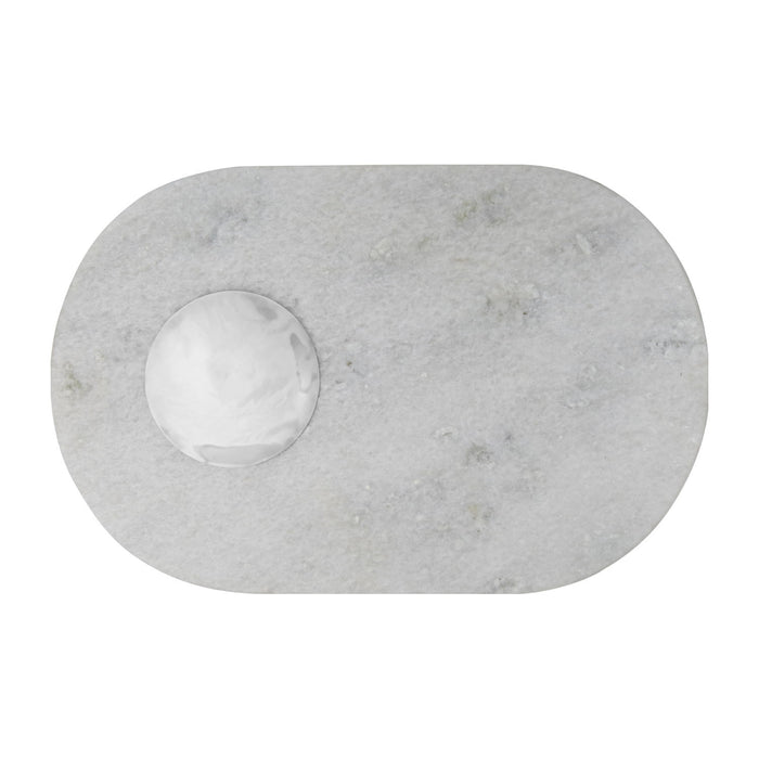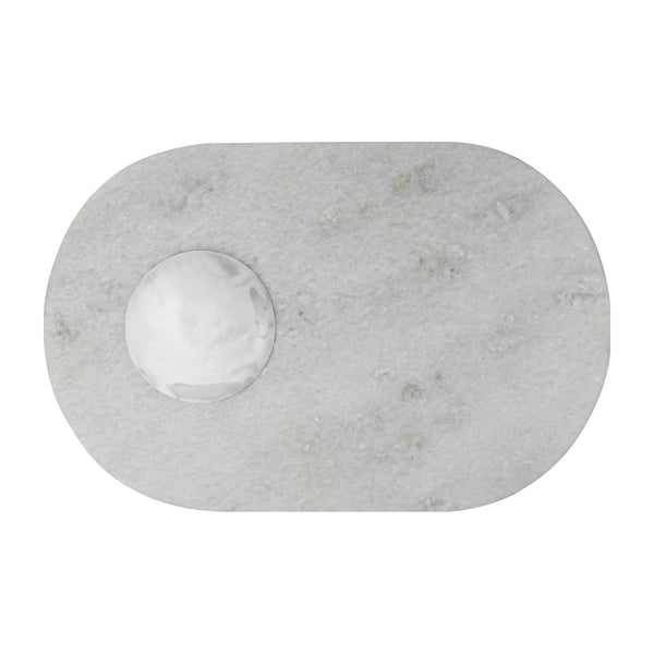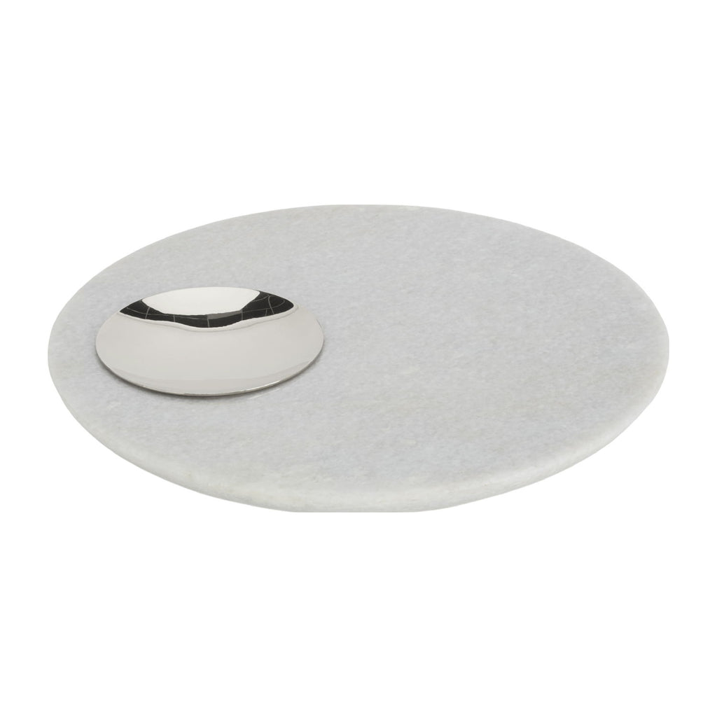 Stone Chopping Board - A kitchen tool to work on and serve from. Chop cut and roll on this slab of white Morwad marble. Ideal for use as a serving platter for meat, cheese or bread. Keep it neat with the delicate removable brass saucer to collect your crumbs or use for dips, pickles oil or spices. The white marble can stain if unsealed and exposed to dark colours like red wine.