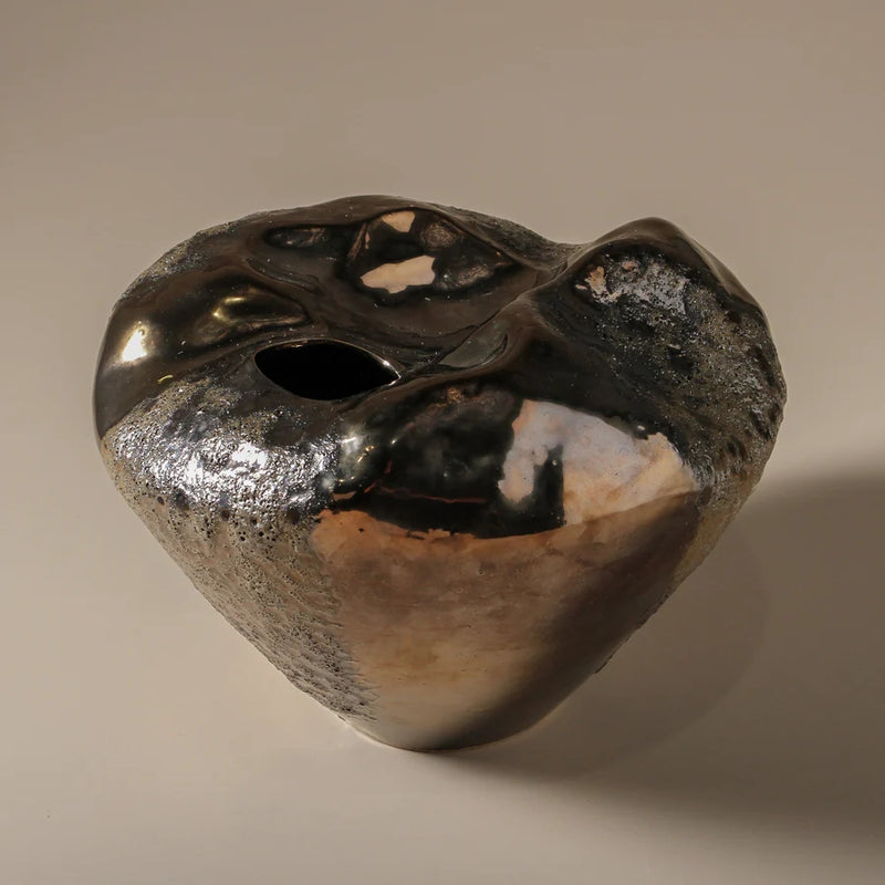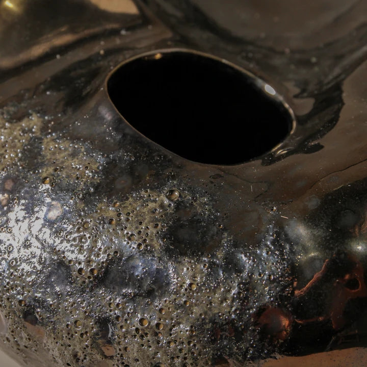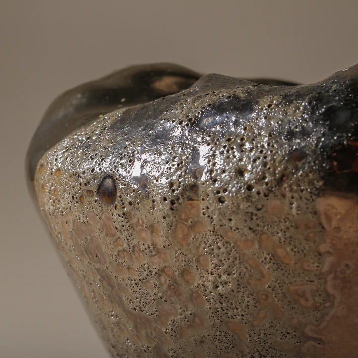 Merging metallic sheen with a rugged, textured surface, the Cinderera Vase features a bronze-like finish with a liquid glaze effect, Its grounded form gives it a sense of presence, while the uneven top adds a raw, sculptural quality. The interplay of smooth and rough textures mimics natural elements shaped by heat and time, offering a design that feels both organic and intentional.