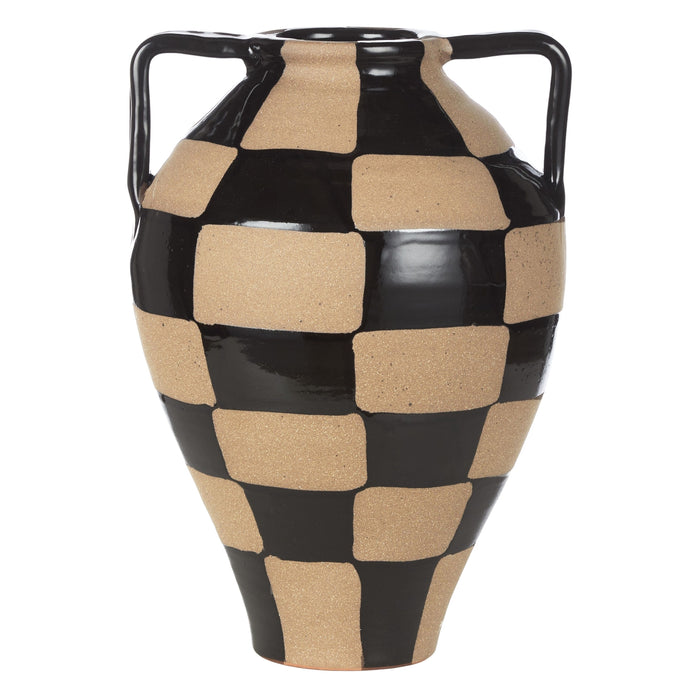 Decorative vessels are a simple but effective way to enhance any space. This Hulton Vase is crafted from terracotta in the form of a Greek urn with handles, with a brown and black checkered pattern. The elegant contemporary silhouette makes it a true statement piece on a tabletop, shelf or window display. It’s perfect to display both fresh and faux flowers in any corner of the home.