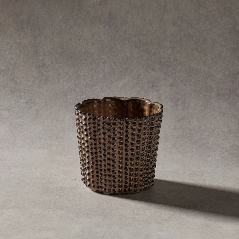 Introducing the Lourise Pot, a ceramic masterpiece adorned with decorative dots that serve as unexpected yet delightful details. This versatile pot functions as both a stand-alone decorative object and a charming home for small plants. The Lourise Pot boasts an earthy colour palette, a glazed finish and a soft, wavy shape, exuding a harmonious blend of natural charm and artistic craftsmanship. The decorative dots, thoughtfully placed, add a touch of whimsy and uniqueness to the pot, creating a visual allure that stands out.