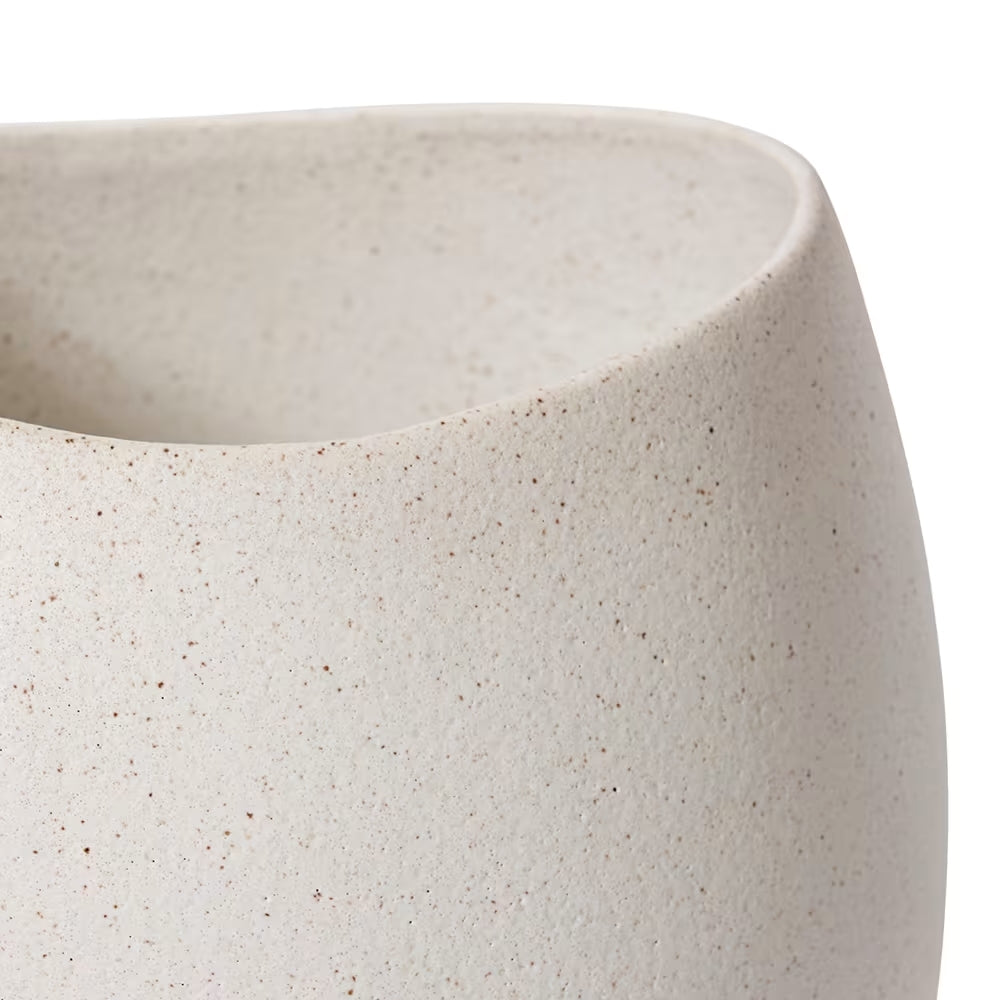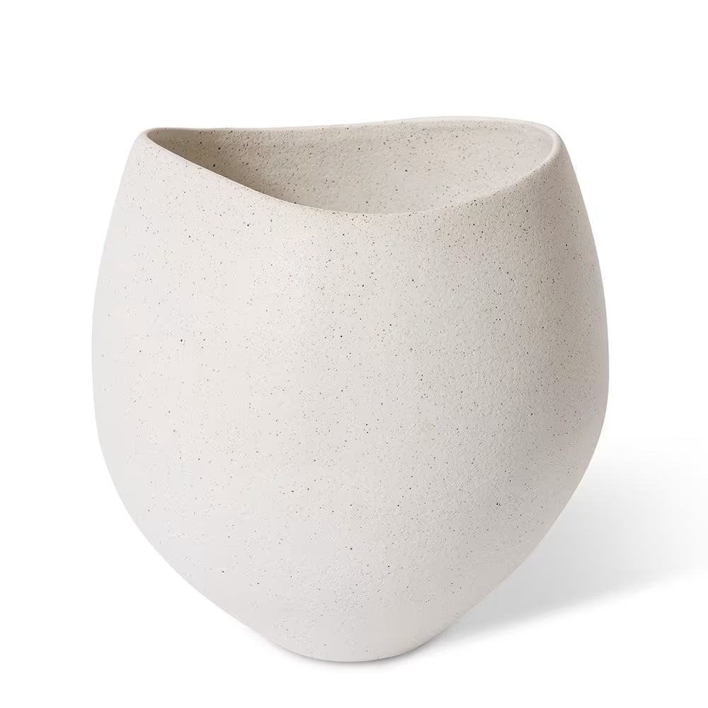 The Matoas Scoop Pot, crafted from premium ceramic with a sleek sandy white finish, is designed to elevate the ambiance of both residential and commercial interiors. This vessel exudes contemporary sophistication, making it an ideal centrepiece for high-end homewares retailers, furniture stores, interior designers, and property stagers. Its unique scoop design adds visual interest while maintaining versatility in various styling contexts. Note that this is not a watertight vase but rather a decorative vessel intended to complement artificial floral arrangements or stand alone as a statement piece. Minor variations in size may occur due to the handcrafted nature of ceramic manufacture.