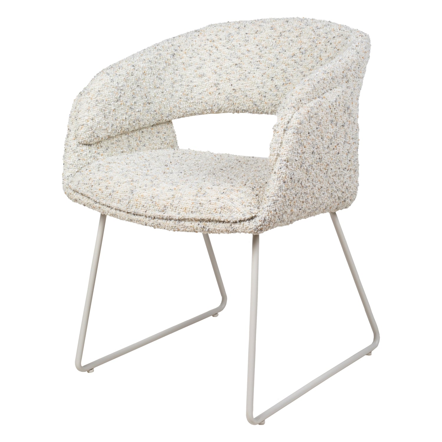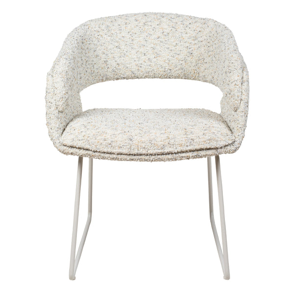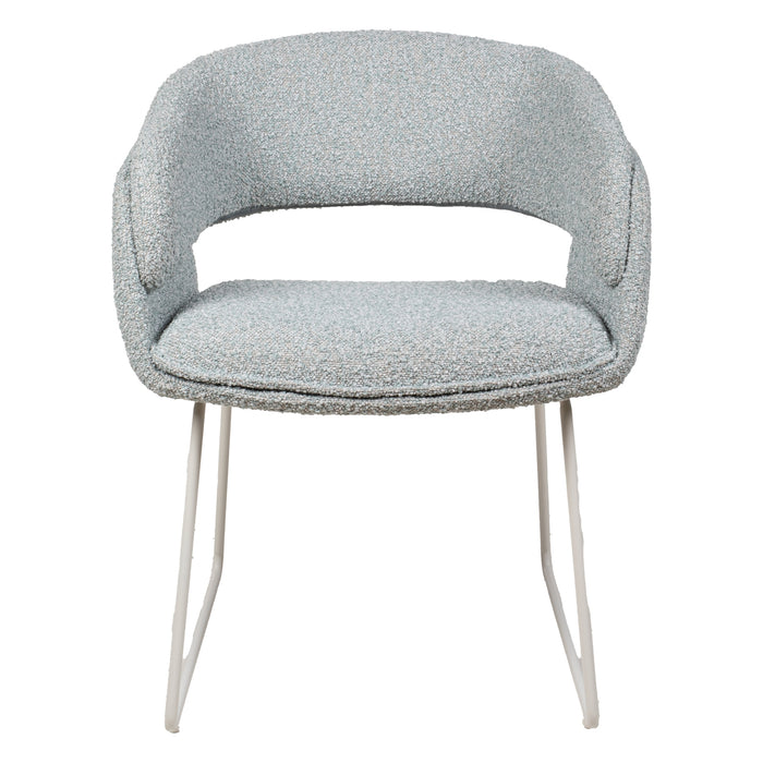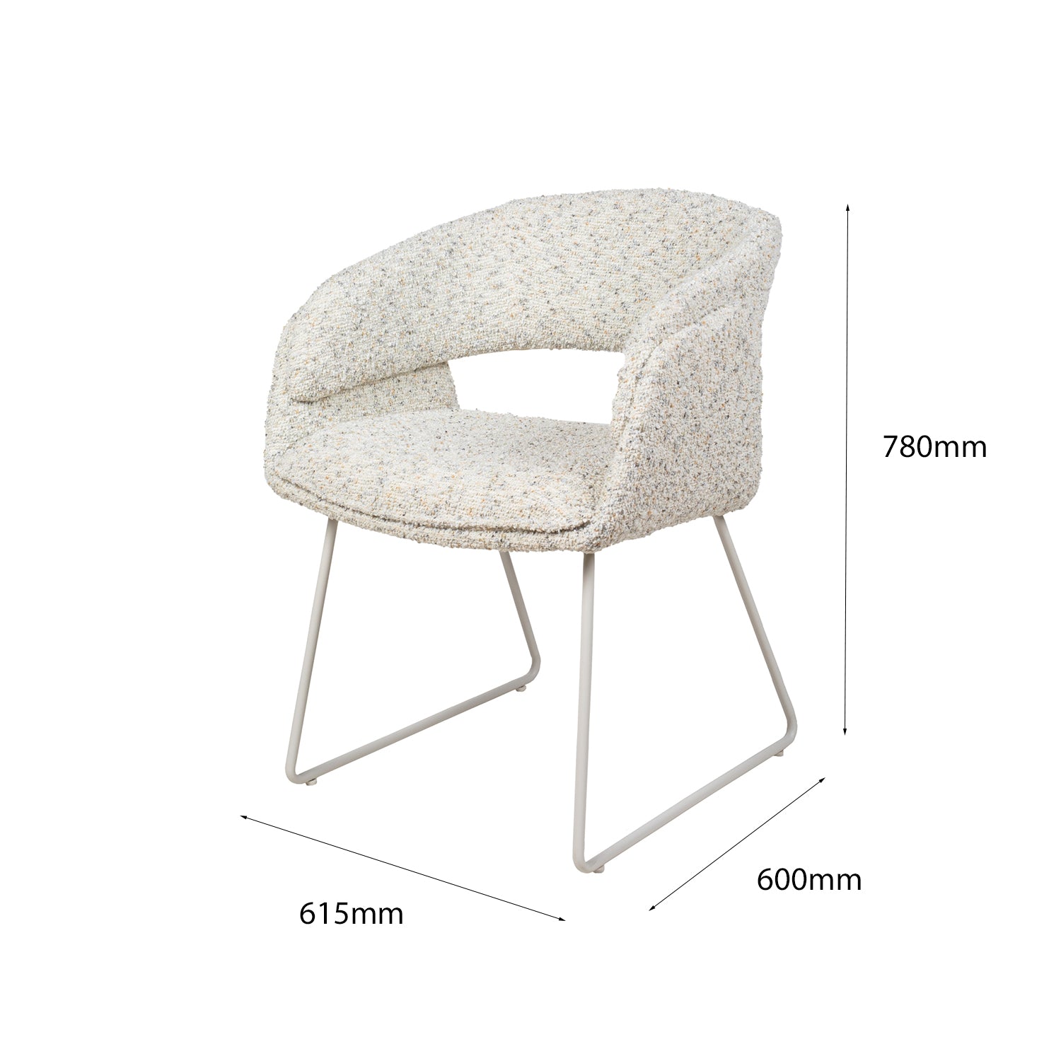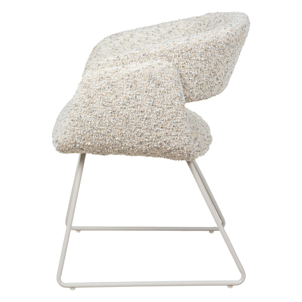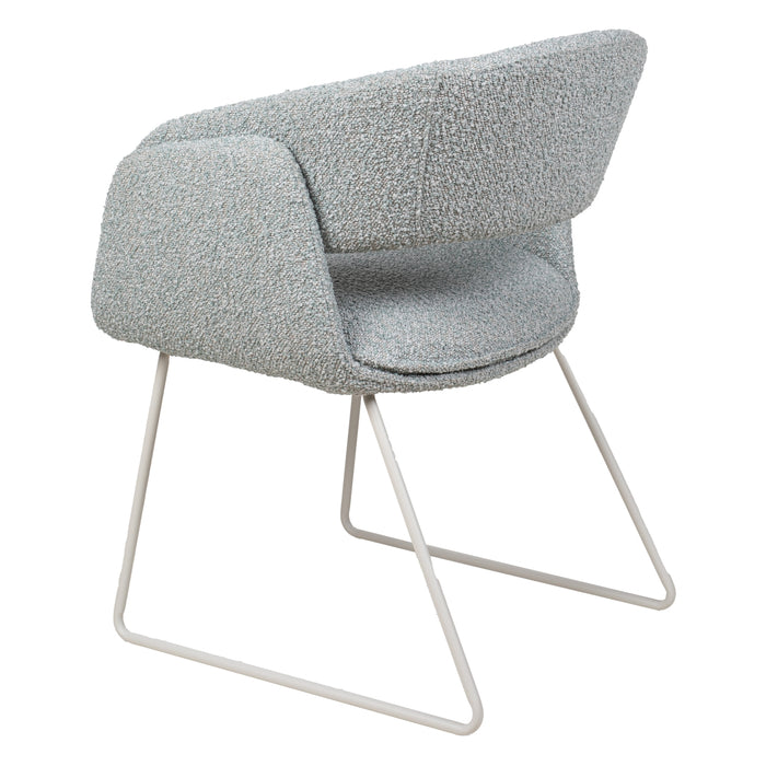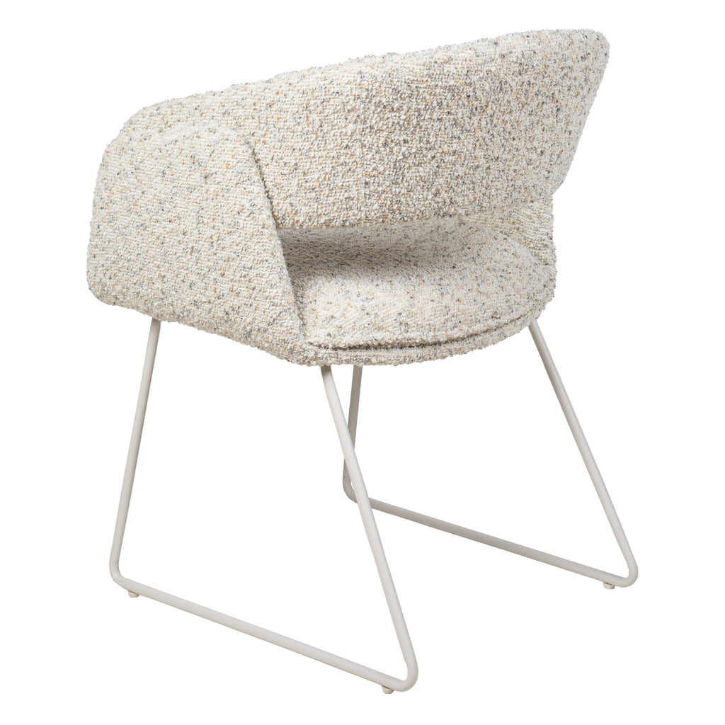 The Polar Arm Chair blends modern design with exceptional comfort. Its curved, wraparound backrest and integrated armrests provide a supportive and inviting feel. The plush cushioned seat enhances relaxation, making it perfect for extended seating. A sleek metal sled base adds stability while maintaining a light, airy look. Ideal for living rooms, offices, or stylish dining spaces.