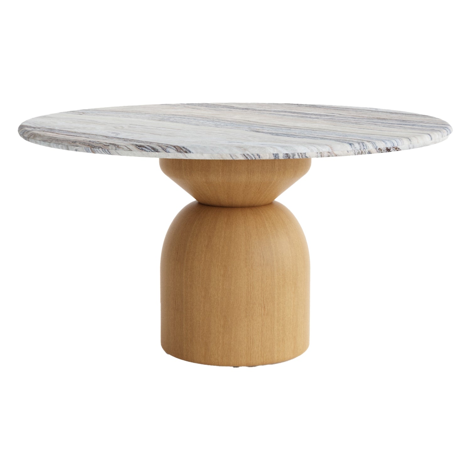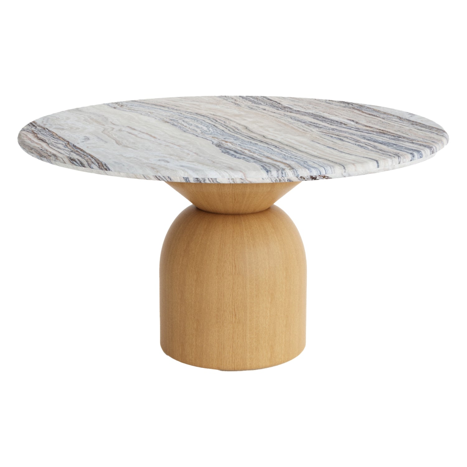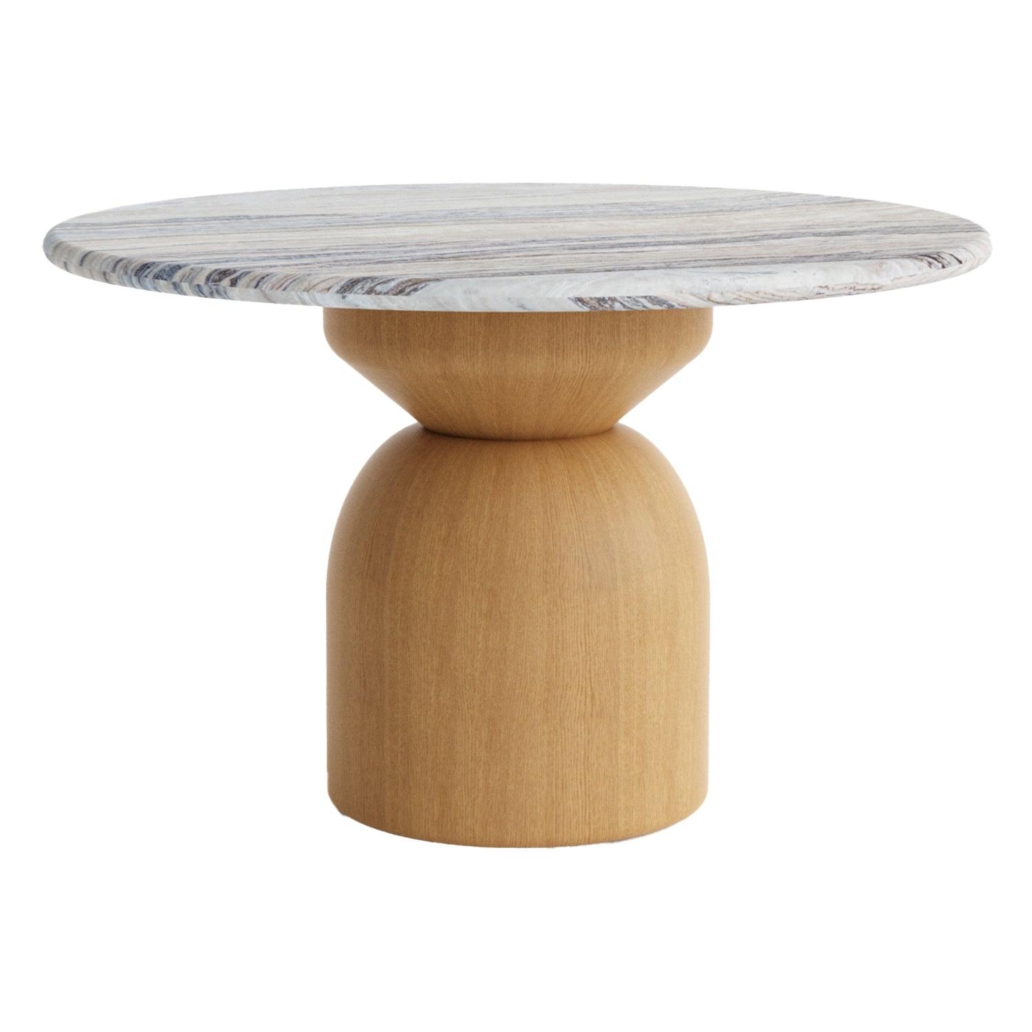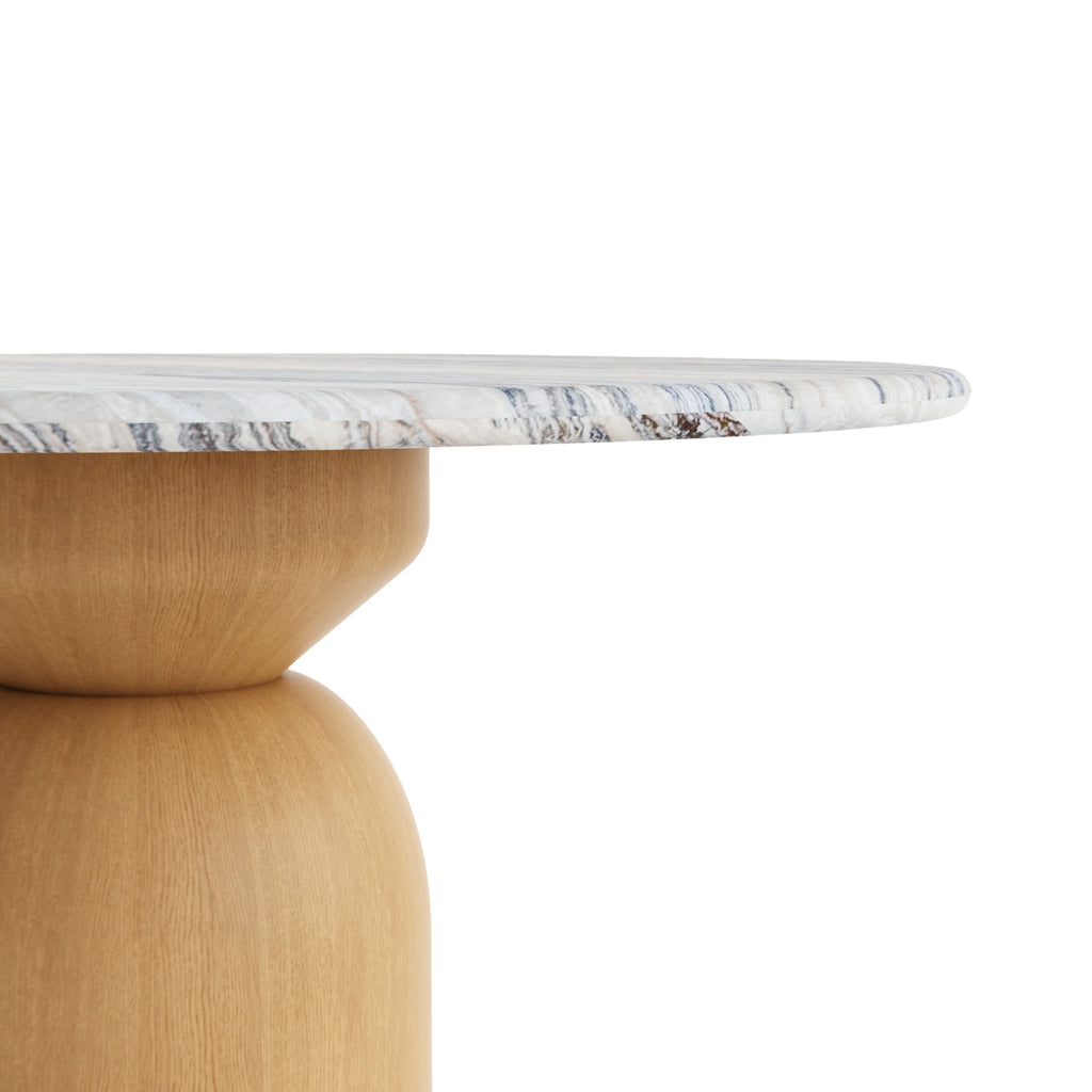 A round table that gathers people in a gentle, natural flow. Its base rests on a single sculptural oak column, the grain soft and warm to the touch. The timber offers a tactile counterpoint to the smooth marble top, creating a balanced composition that feels both refined and inviting.