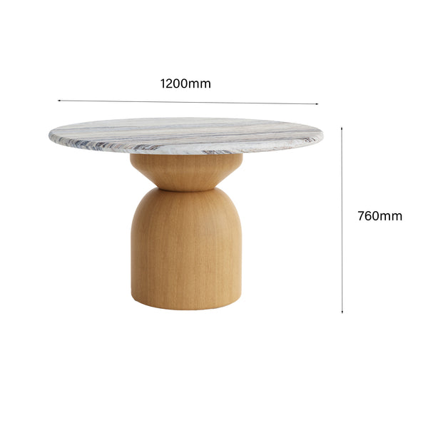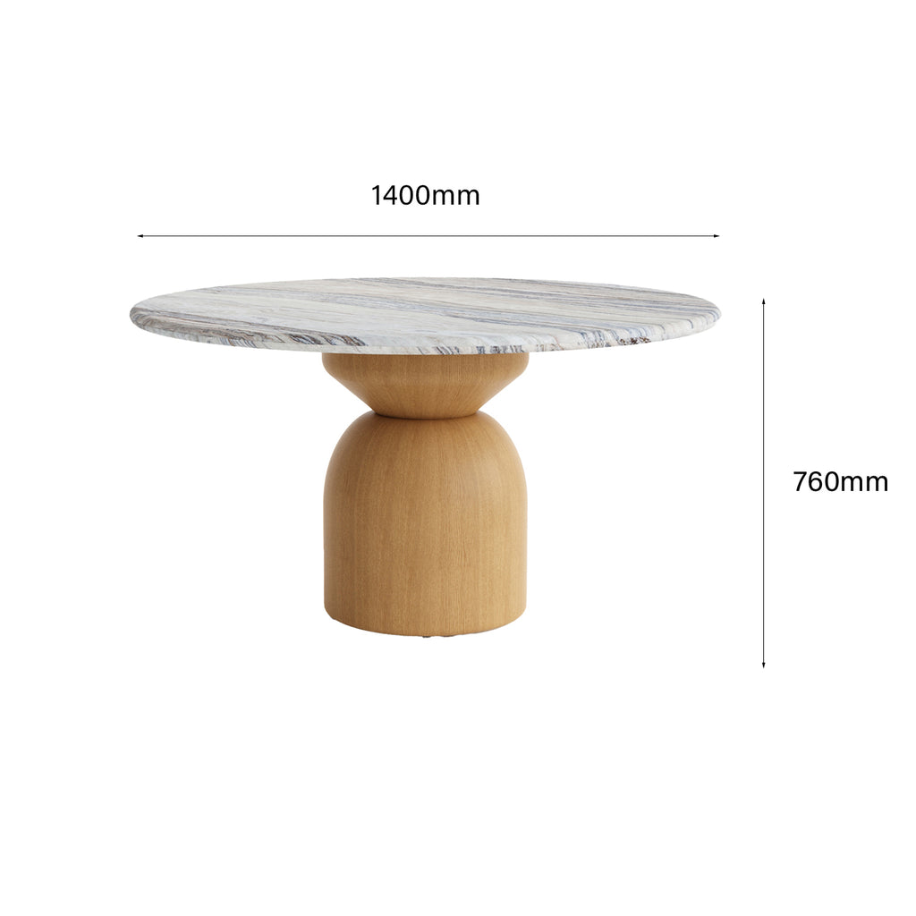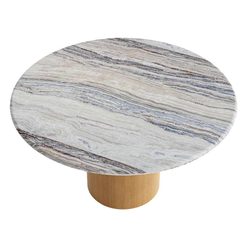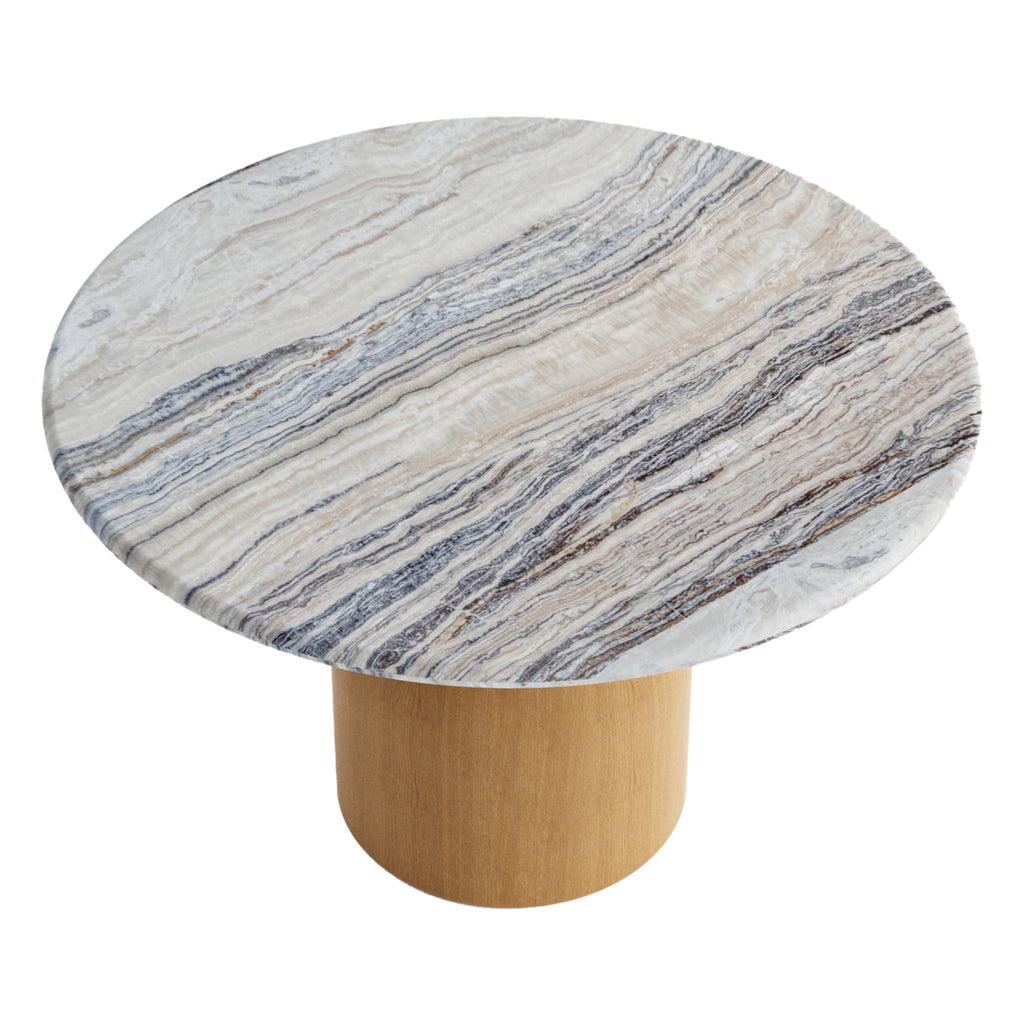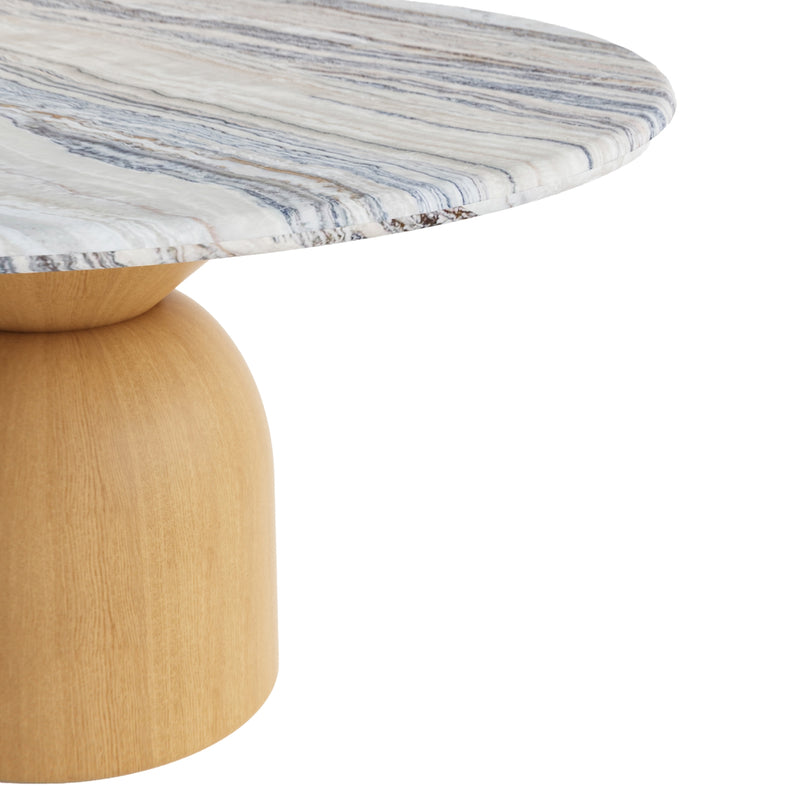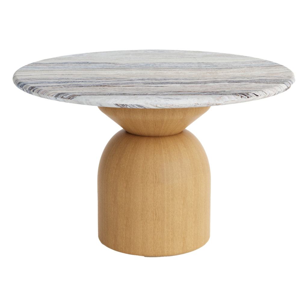 A round table that gathers people in a gentle, natural flow. Its base rests on a single sculptural oak column, the grain soft and warm to the touch. The timber offers a tactile counterpoint to the smooth marble top, creating a balanced composition that feels both refined and inviting.