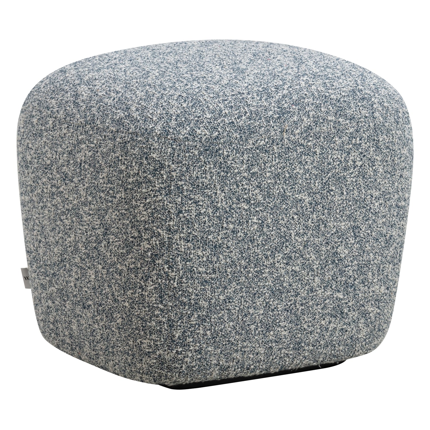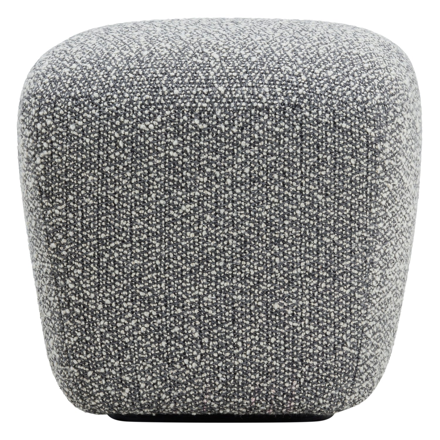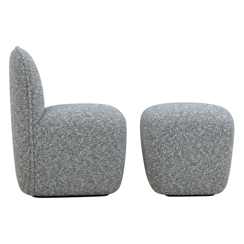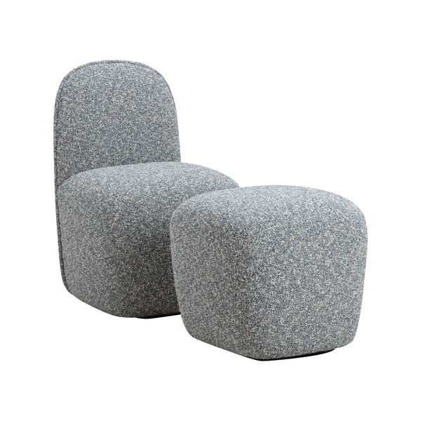 The petite proportions of the compact chair and pouf are meticulously designed with gently angled fronts, ensuring ample foot clearance. Fully upholstered sides extending to the ground result in a compact footprint and a visually light expression, displaying a charismatic and cute aesthetic.