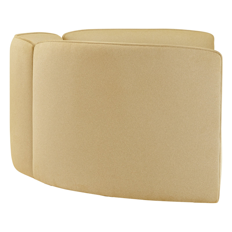 The petite proportions of the compact chair and pouf are meticulously designed with gently angled fronts, ensuring ample foot clearance. Fully upholstered sides extending to the ground result in a compact footprint and a visually light expression, displaying a charismatic and cute aesthetic.