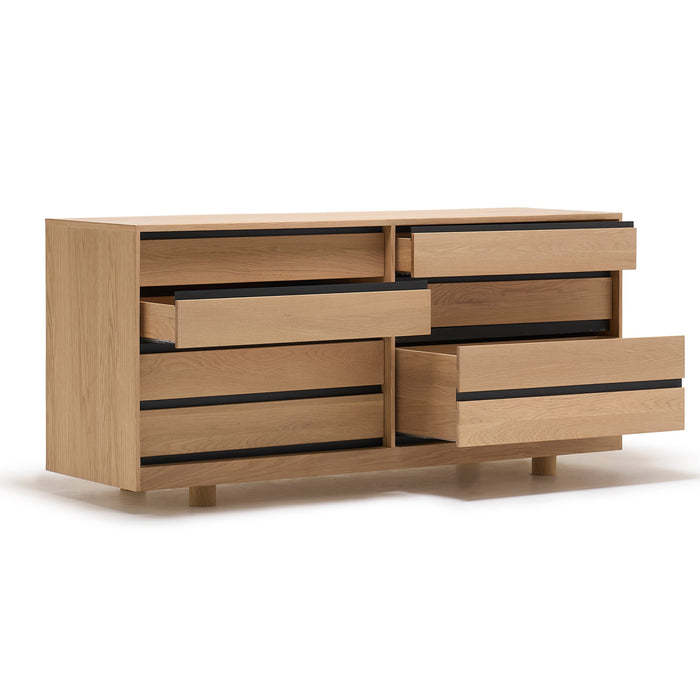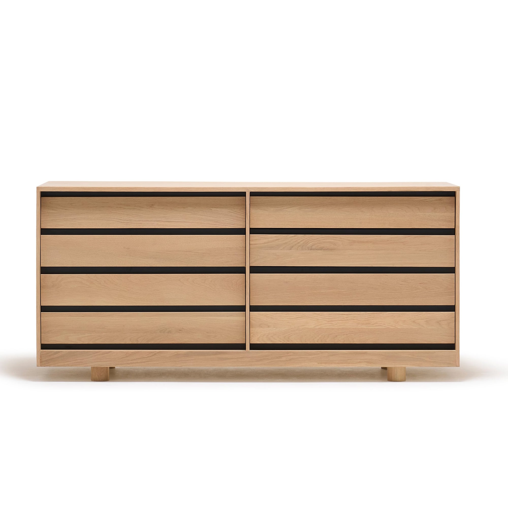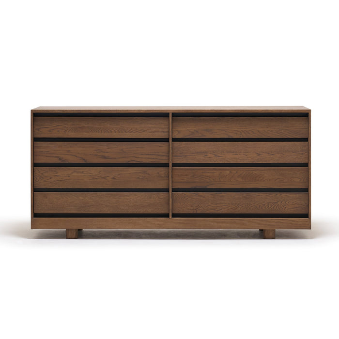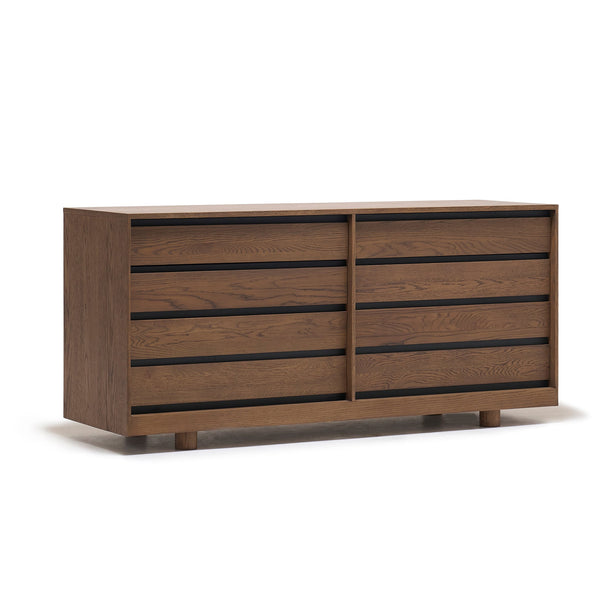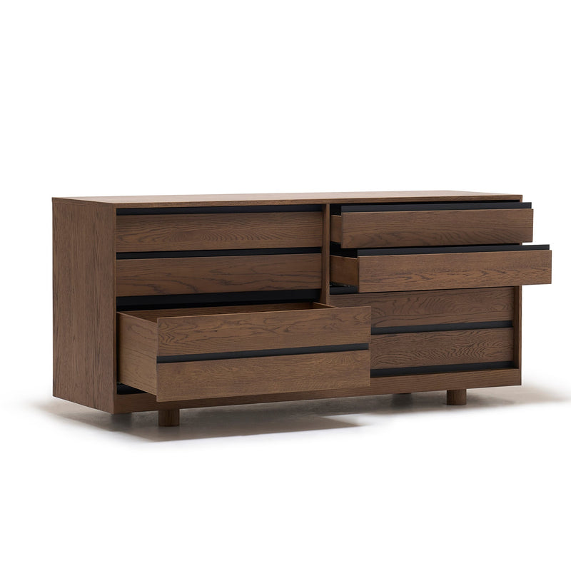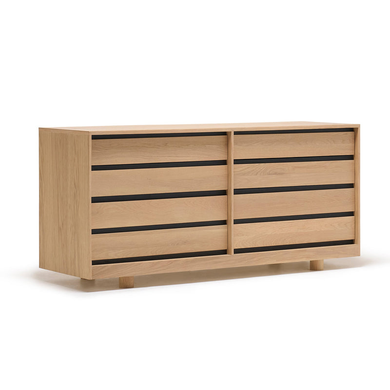 The Cog Series is a nod to the minimalist principles of traditional Japanese drawers. Horizontal black metal strips fill the gaps between the drawer fronts, creating the illusion of open space while providing functional storage, all while maintaining a handle-less, clean facade.