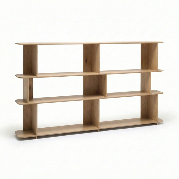Perpendicular panels intersect to form the uprights, which, arranged in alternating directions, create a feeling of movement and break up the symmetry, while also offering interesting display and storage options.