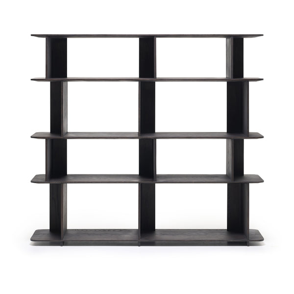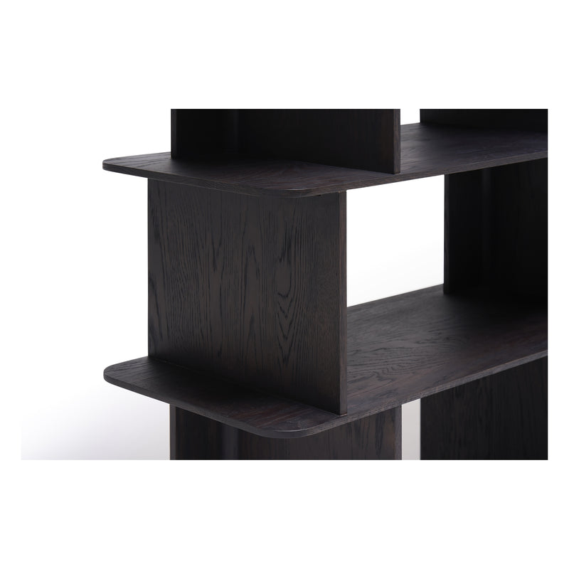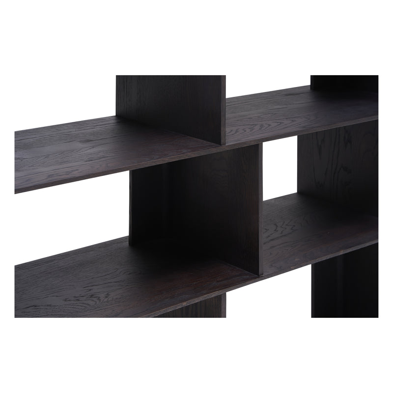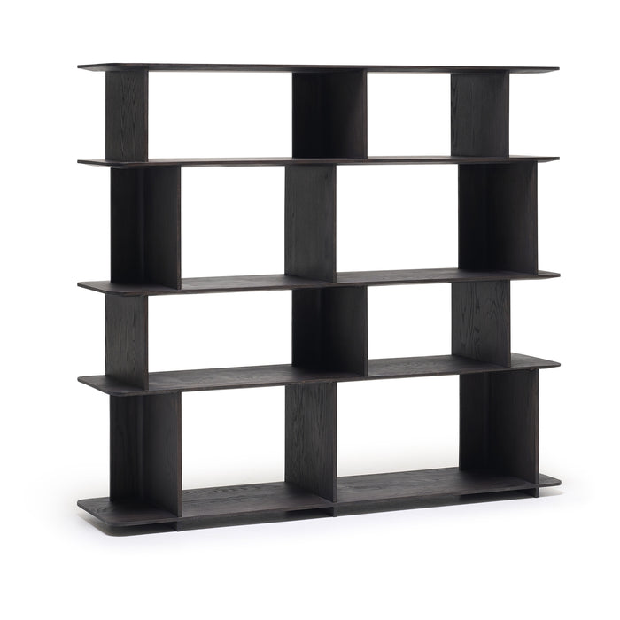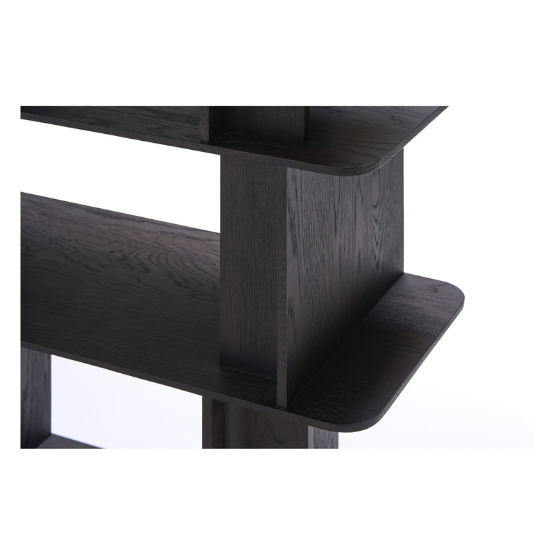 Perpendicular panels intersect to form the uprights, which, arranged in alternating directions, create a feeling of movement and break up the symmetry, while also offering interesting display and storage options.