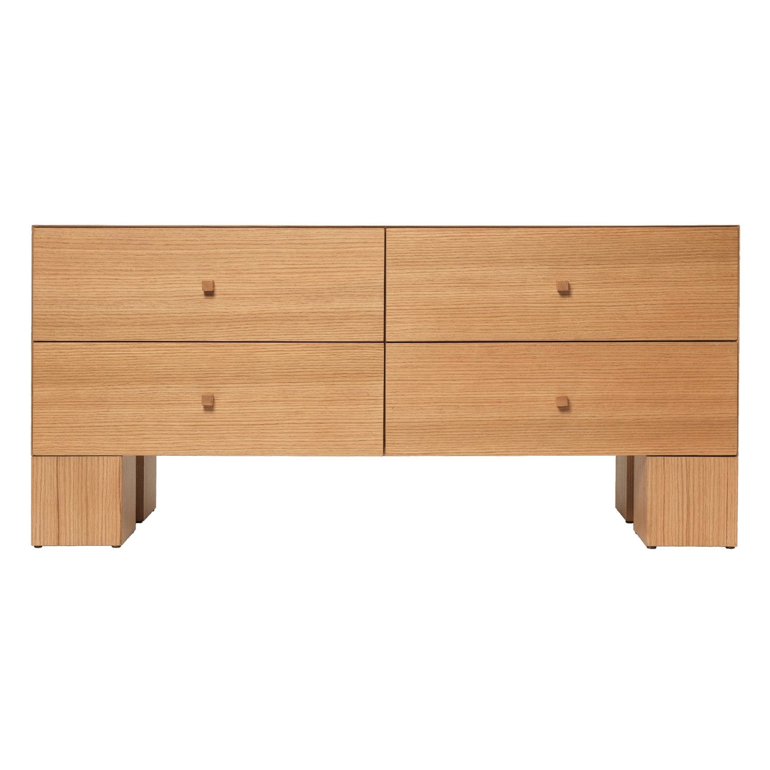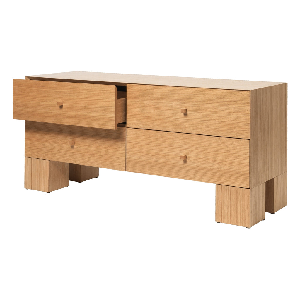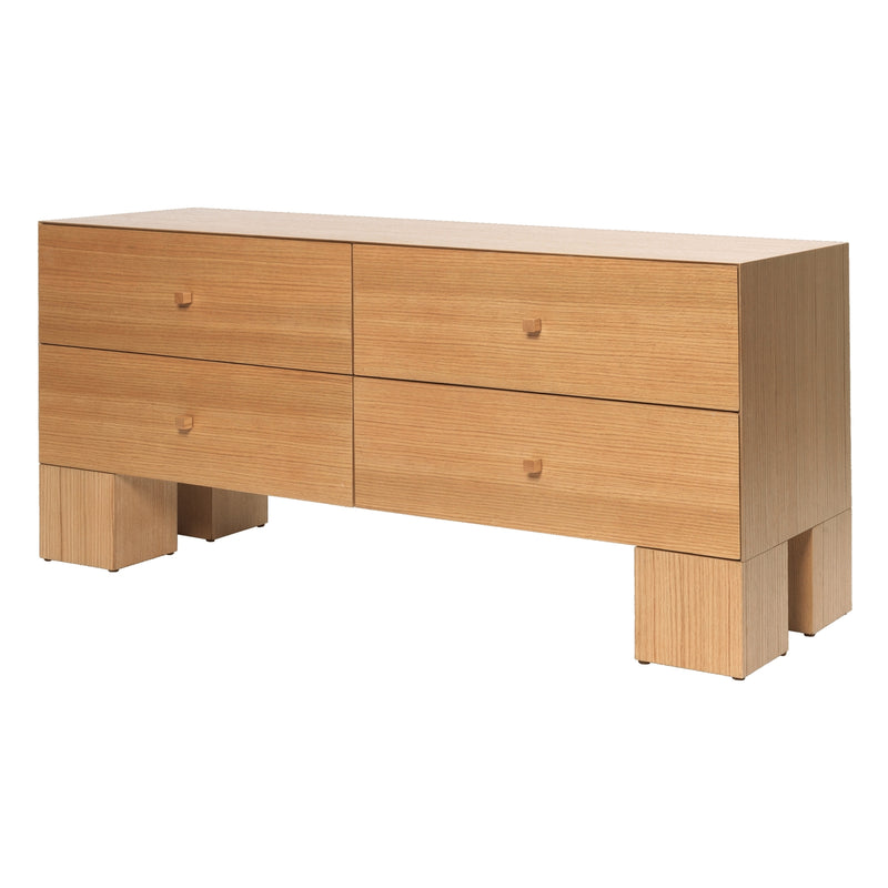 The Kuben Drawers are crafted from FSC™-certified natural oak veneer. Its sharp, cubic form and mitred joints craft the illusion of a seamless box, while the oversized cube-shaped feet introduce a bold character. Delicate handles introduce a refined touch, enhancing the design's playful intrigue. Effortlessly combining functionality with a minimalist aesthetic, it offers generous storage space for clothing and other essential items.