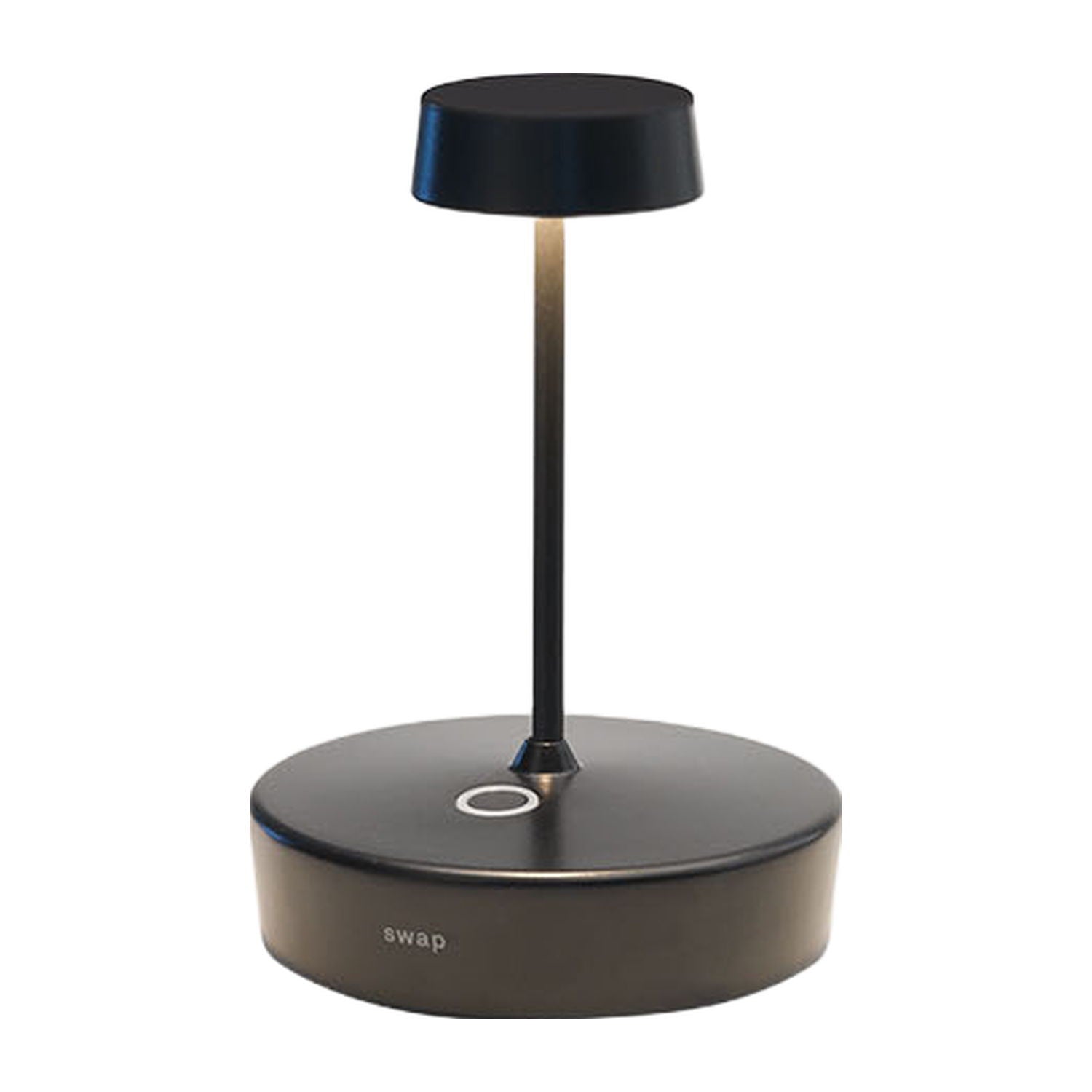 Swap Mini Table Lamp by Zafferano Ai Lati Lights is a battery-operated portable and rechargeable table lamp. It is equipped with contact charging base and dimmer touch control.