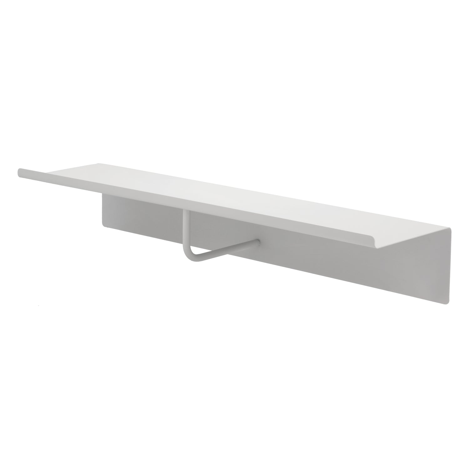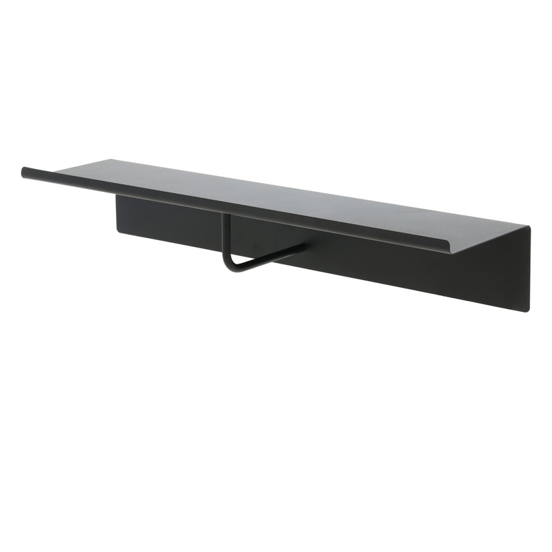 A blissful union of minimalism and functionality. The hat shelf takes up surprisingly little space. It consists of a top shelf with space for hats, gloves, umbrellas etc. Under the shelf there is a perpendicular hanger bar so that you see the front of a coat, not just the shoulder. This adds a dressy touch in the hallway. There is room for 4–5 items of outerwear, depending on their thickness. The concealed fitting ensures there are no visible screws. Made of powder-coated steel.