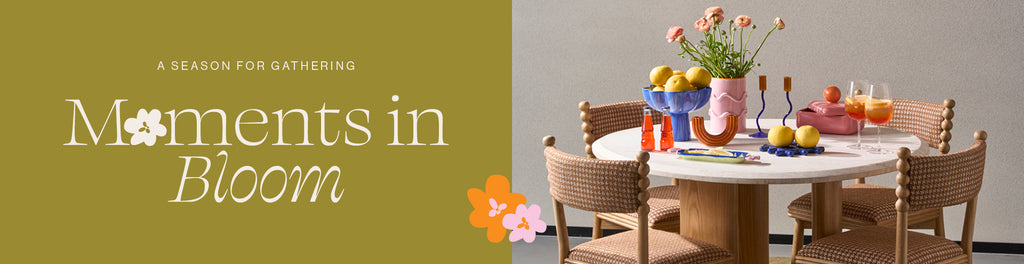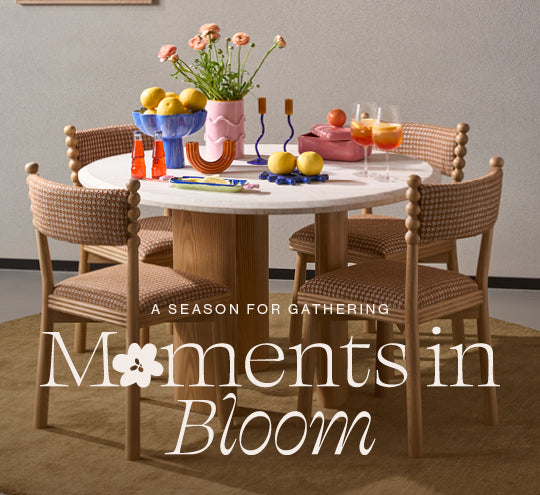 The season’s soft shift in light invites us to linger a little longer at the table and to notice the small, generous things that make gathering feel effortless. Moments in Bloom is an edit of pieces that brighten and open your rooms — a study in texture, colour and carefully considered form. Here you’ll find new dining chairs that feel slightly whimsical, sculptural tables that anchor conversation, and layered surfaces that catch the afternoon and hold it.
