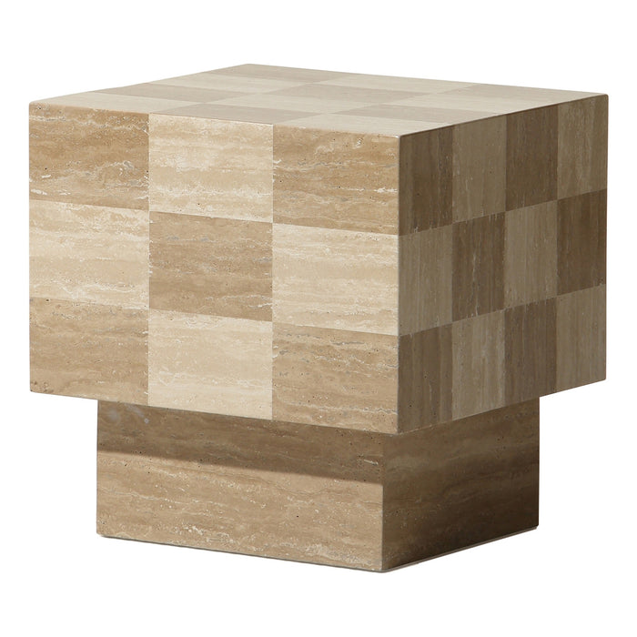 Elevate your living space with the Checkmate Side Table. Its unique checker table top of Brown and Ivory Travertine adds a touch of sophistication to any room. The sturdy Brown Travertine base ensures durability and stability. Perfect for holding all your essentials within reach.