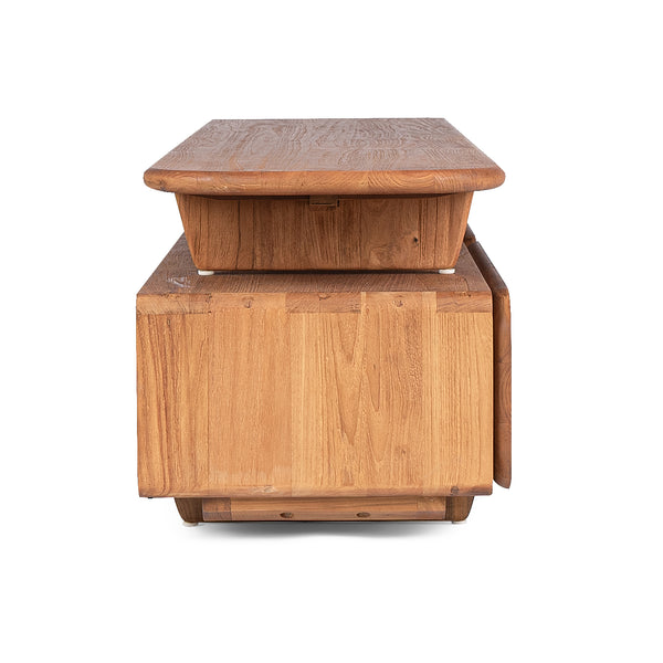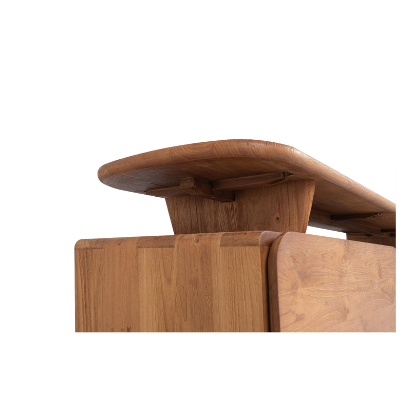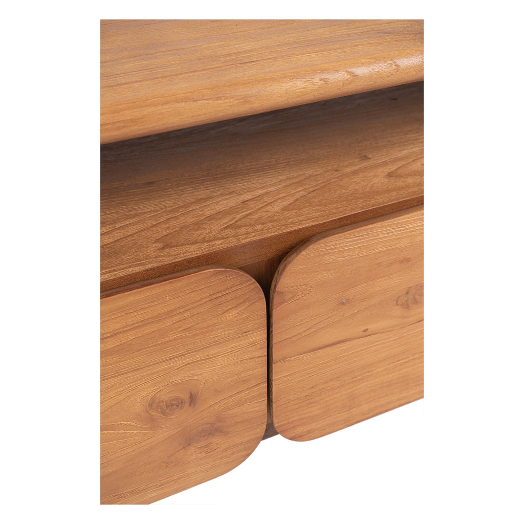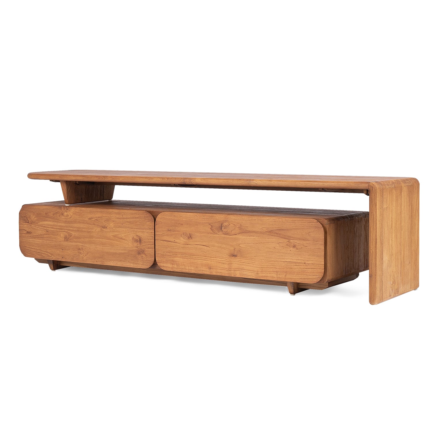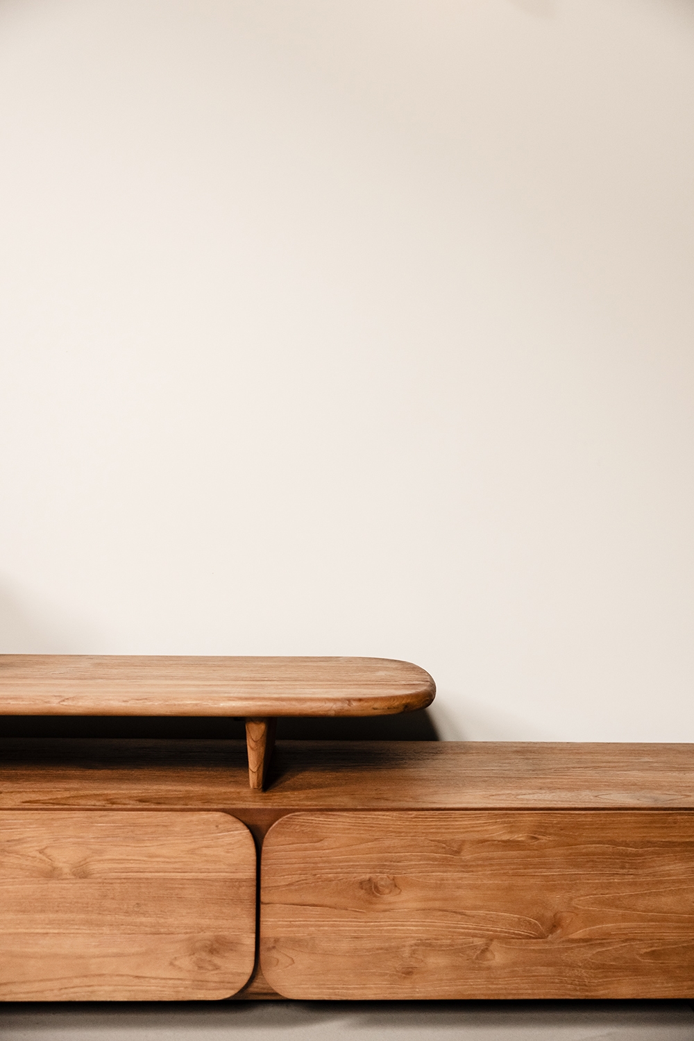 The extendable sideboard from the Tess collection is crafted from reclaimed teak wood and available in three sizes. The rounded top section rests on a double drawer module equipped with a soft-close system. Designed to adapt to any space, this sideboard is a true eye-catcher with a modern-retro appeal.