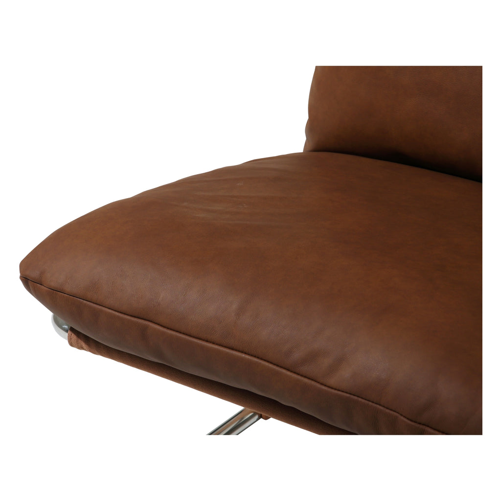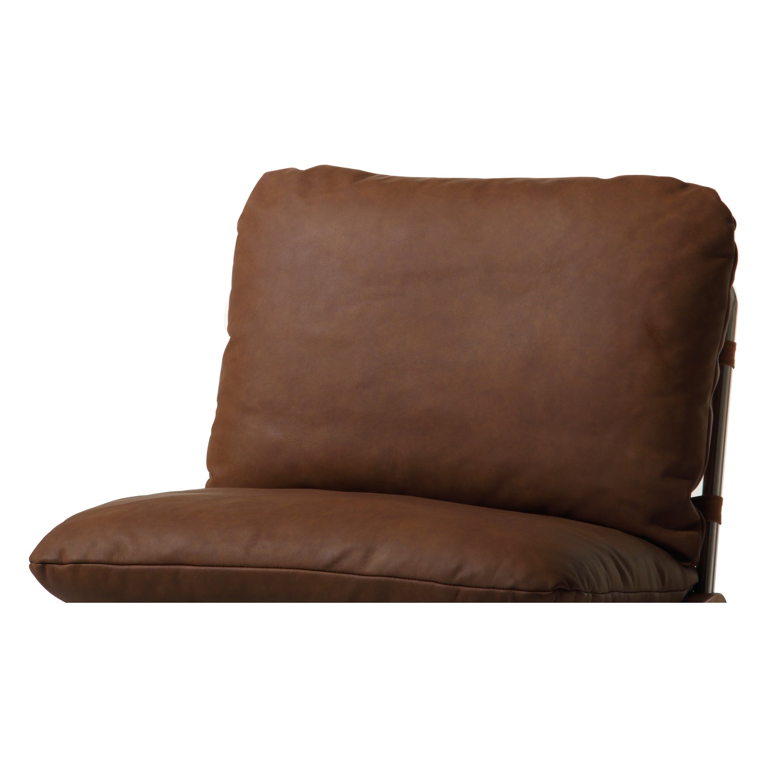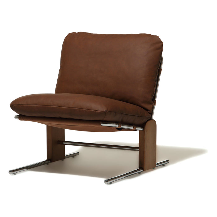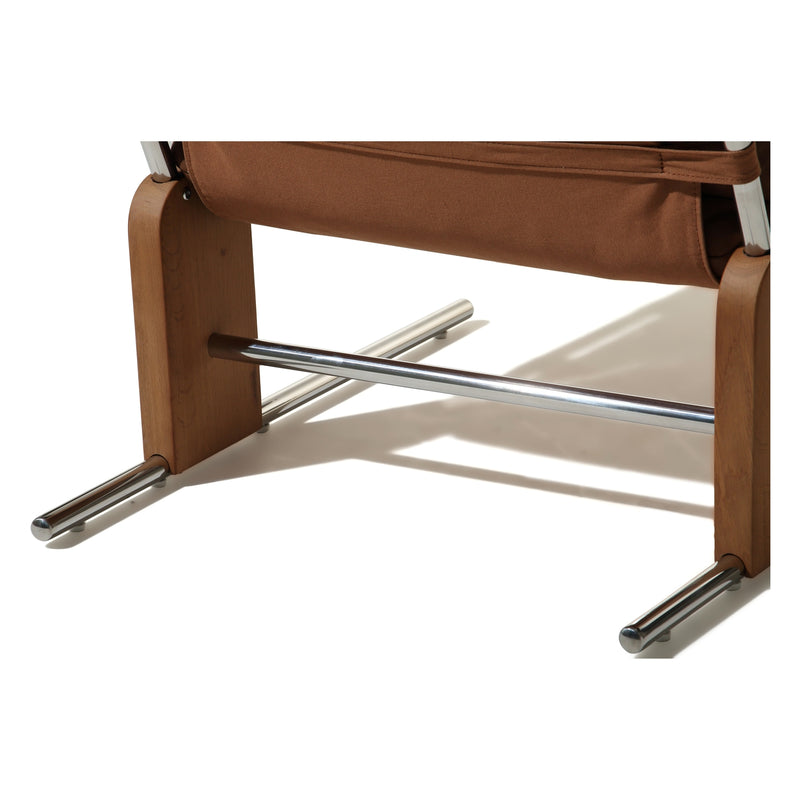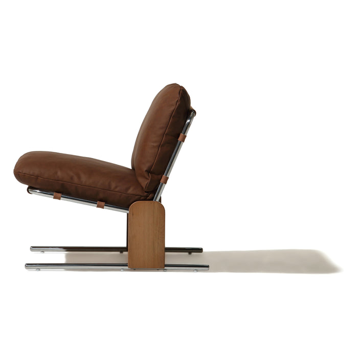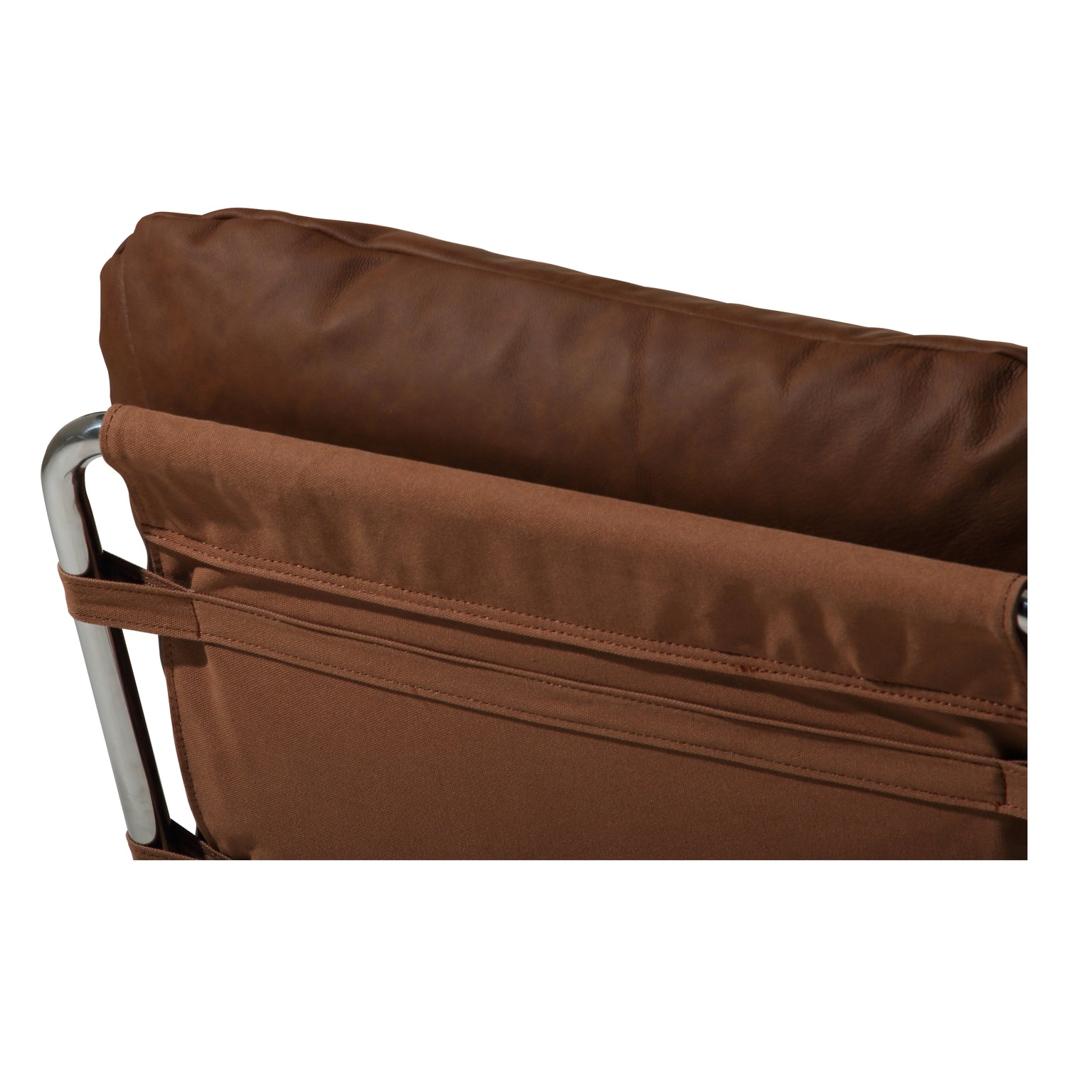 The Eternity Occasional Chair boasts a Legacy Brown Leather Back and Seat Cushion, Dark Brown Canvas Sling, and Smoky Brown Oak Legs with Polished Stainless Steel Feet. Experience unparalleled comfort and style with this timeless addition to your home or office.