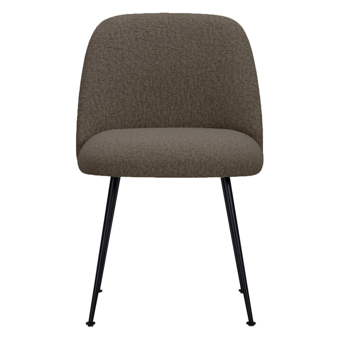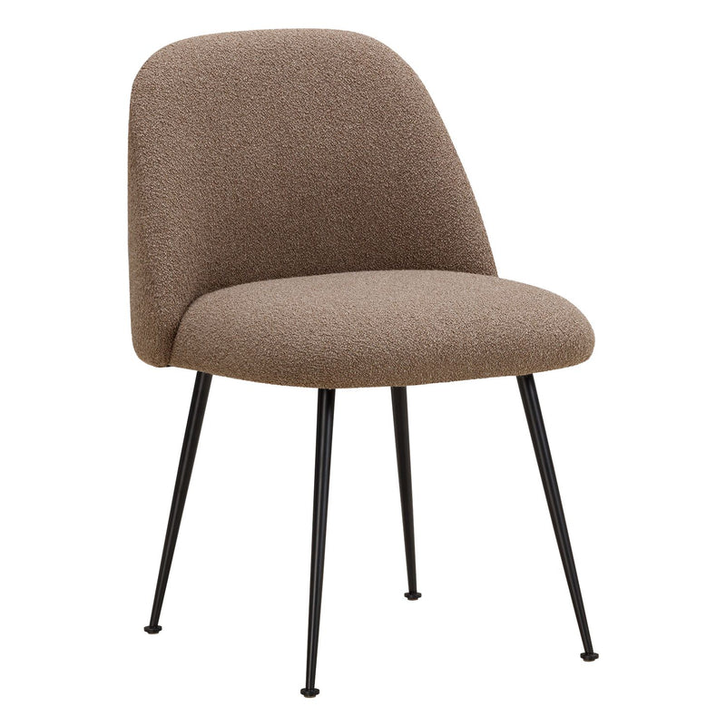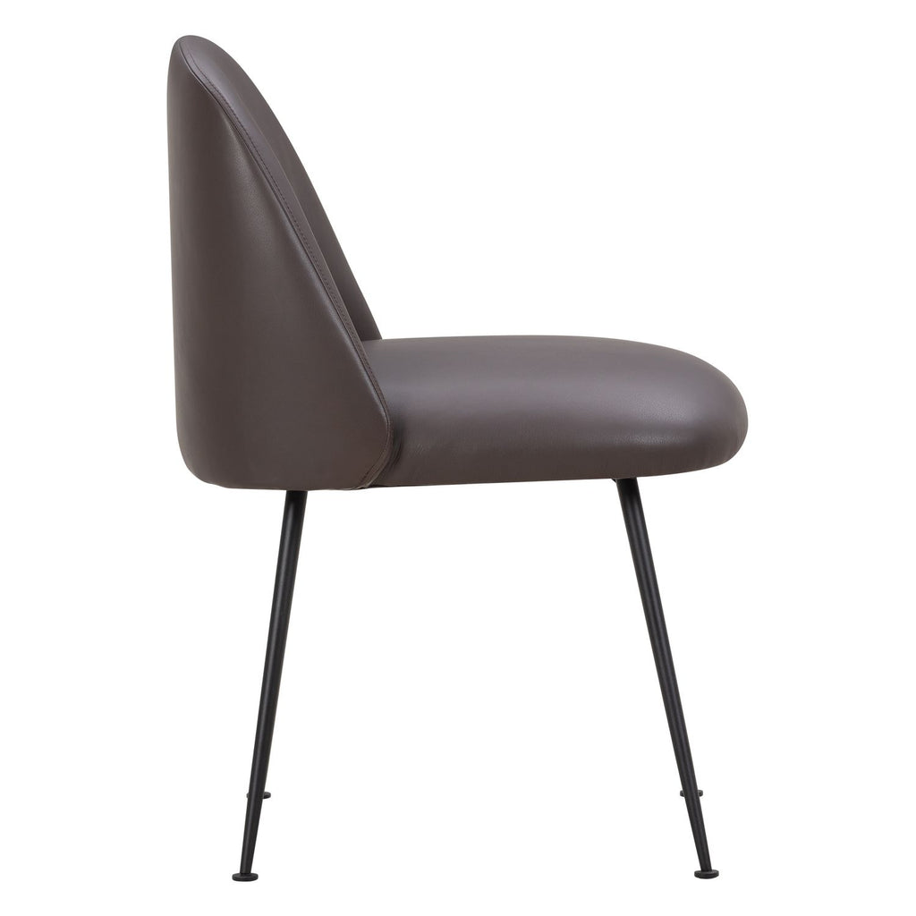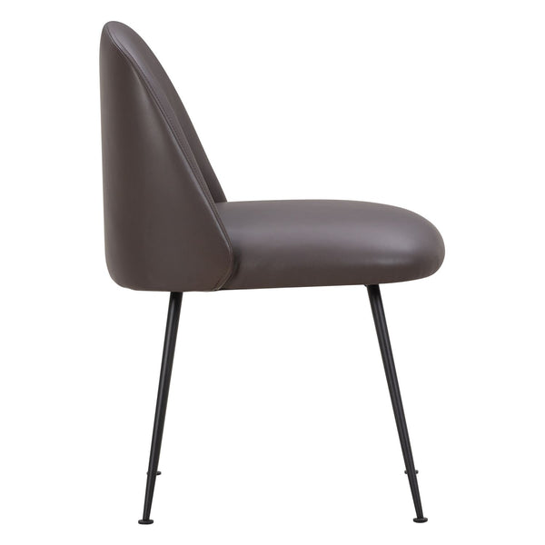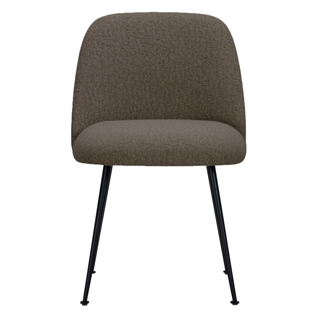 The chair is offered with legs in black powder-coated steel as well as brown and black stained oak. The outer sides of the oak legs are rounded, whilst the inner part is plane and meets the wooden seat frame in an elegant curve. With an almost invisible transition between the upholstered seat and the legs, the steel version adds a more graphic character to the design, further accentuated by its slim and tapered profile.