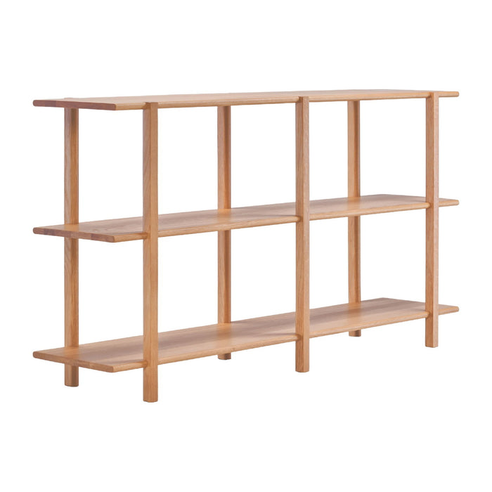 Mentsen designed the Farnsworth shelf to be strong yet visually light. The beauty of this architecture-inspired piece is in the repeating interlocking joints – a structure that does away with diagonal bracing in favour of clean horizontal and vertical lines. At each interval, the oak shelves appear to clasp the uprights effortlessly. Farnsworth comes in two different heights.