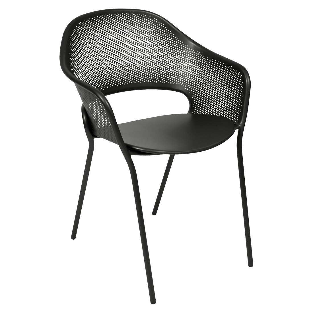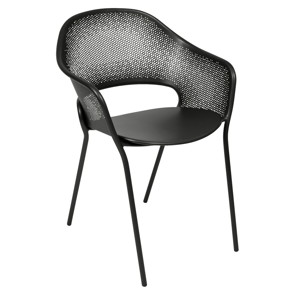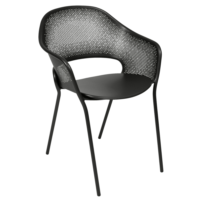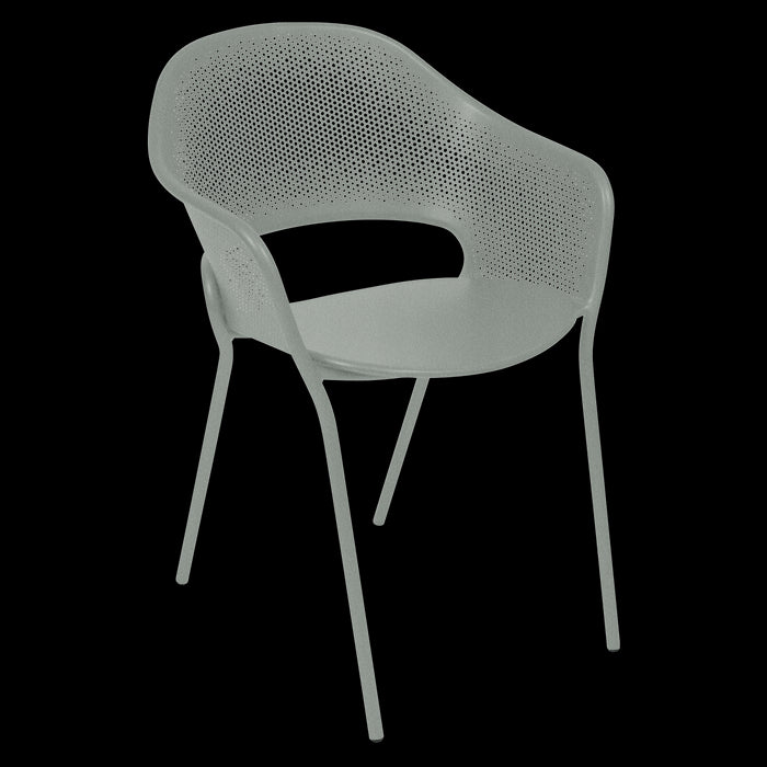 The shell backrest, which fits neatly to the structure, develops a complex system of irregular perforations that spread out harmoniously. The overall design flirts with haute couture to achieve a technically demanding aesthetic offering.