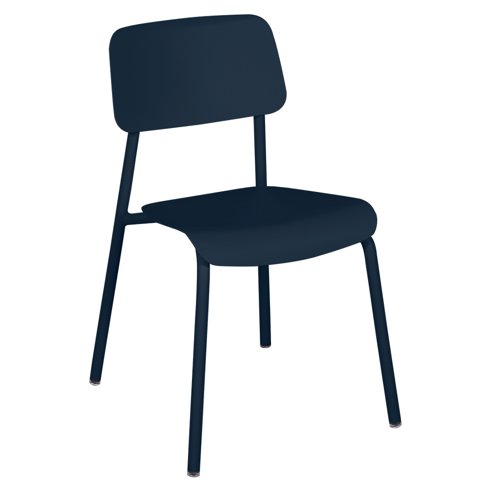 Dive back into your childhood and allow nostalgia to win you over with the Studie chair, inspired from our classroom chairs. Created by Tristan Lohner, designer and long-standing Fermob partner, inspiration is drawn from our iconic classroom chairs and their refined lines, to which a contemporary touch is added, giving them a wonderfully stylish look! Simplicity is beauty... And that is what you will undoubtedly tell yourself when looking at the Studie chair. Its contemporary and unadorned look makes for a stunning item. Its curved seat invites you to sit back and relax: just by looking at it you can already tell that you will be comfortably seated... Although this chair is inspired from our classroom chairs, it has been greatly optimised in terms of comfort: the curve of its seat and backrest is ideally designed to fit the shape of our bodies. Another noteworthy difference: the chair is equipped with Fermob-patented glide pads, allowing it to be moved on the floor without any noise - a welcome change from the racket our school chairs made! Finally, these metal chairs are easy to stack for storage: they are very light thanks to their aluminium build and their stacking pads protect them from scratches. Moreover, they are extremely resistant to weather conditions, including by the sea. Last but not least: they are built in aluminium and equipped with removable pads, and are entirely recyclable. Another added bonus for the Studie chair! Browse our extensive colour chart to find the option that pleases you most, and combine your chairs with any Fermob table. Place them in your outdoor spaces, balcony or indoors, around your dining room table. With the Studie chair – which you may spot on your favourite restaurant's stylish terrace – the possibilities are endless!