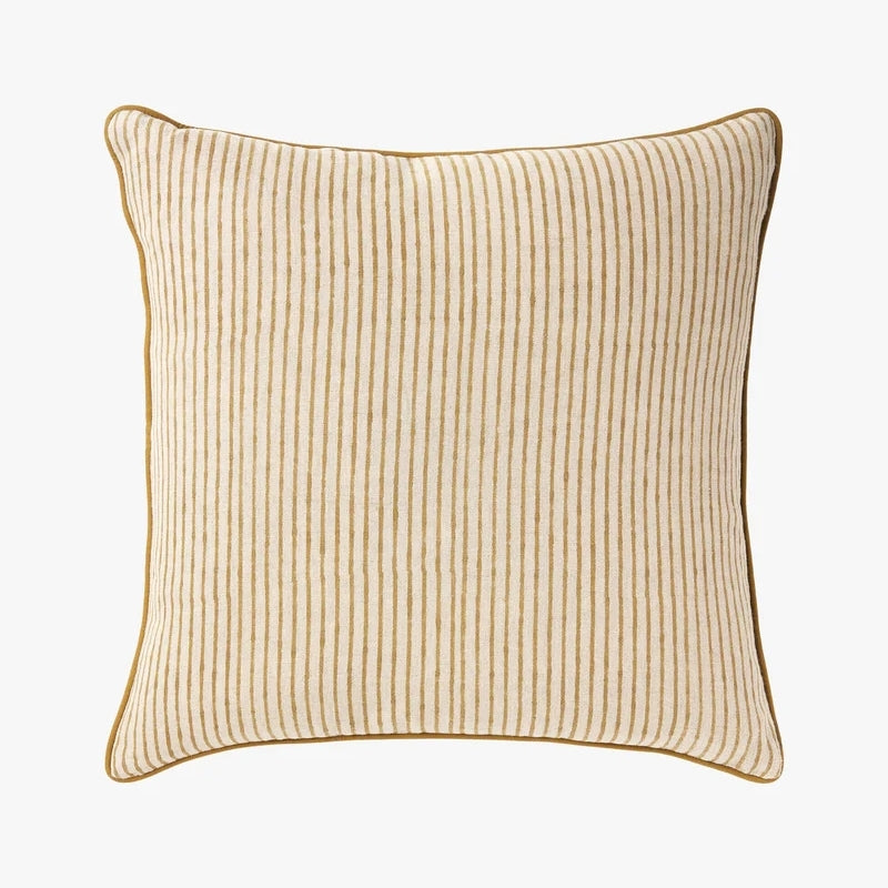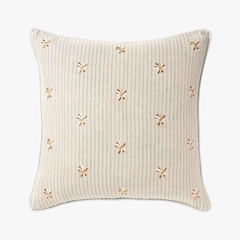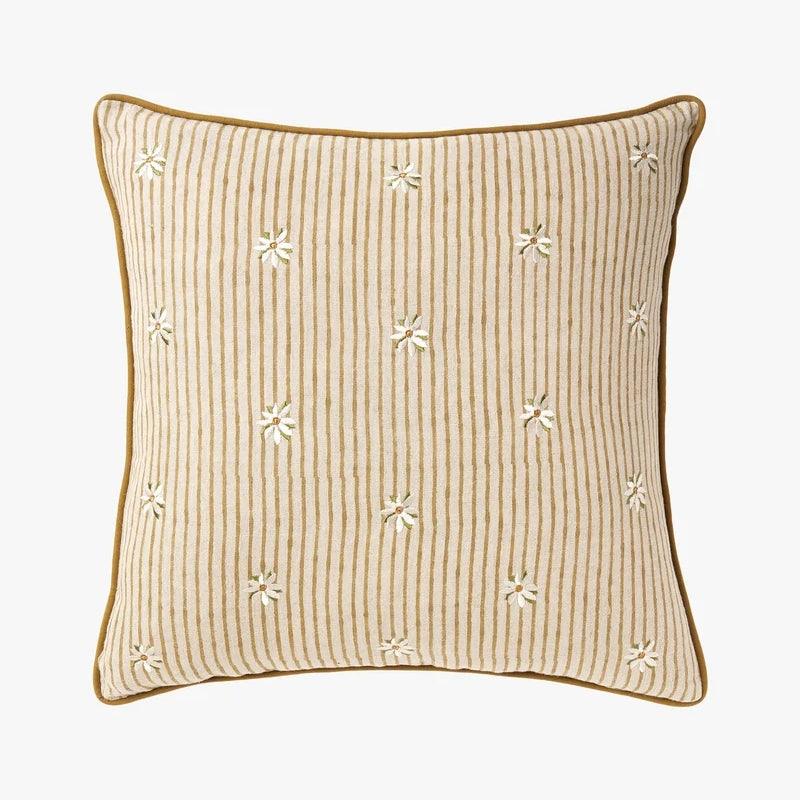 A testament to traditional craftsmanship and design, the Florette cushion features a painterly hand-block printed stripe, layered with an embroidered daisy motif. Crafted on pure linen and finished with a solid piped edge, this unique design brings beautiful depth and tactility to any space.