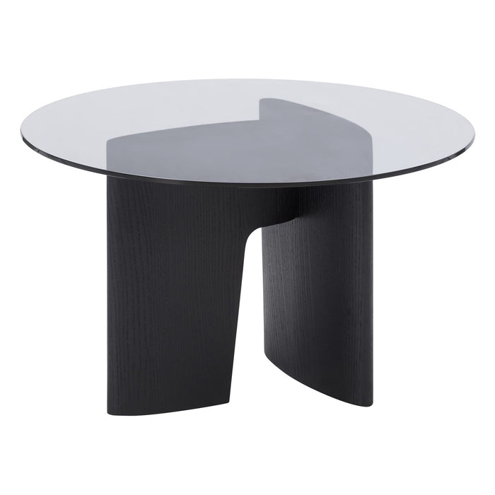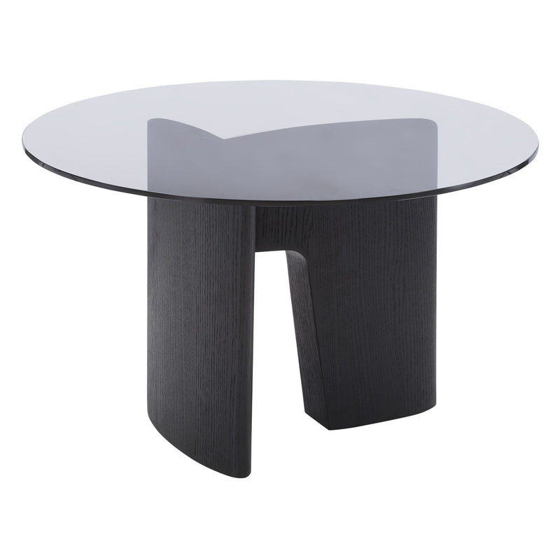 Symbolic, archaic references and a sculptural silhouette define the Glyph Side Table, designed by the German studio, Hoffmann Kahleyss Design. A slightly translucent tabletop in black-tinted tempered glass appears to be floating while revealing the characteristic cross-sectional view of the base components. Crafted in black-stained oak veneer, two pointy ellipses elegantly meet in a T-shape. Lowering the gaze, the shape is interrupted by a gently sloping gap that adds lightness and counter-plays the bold appearance of the design.
