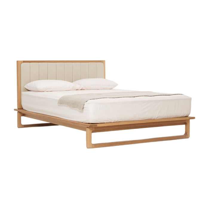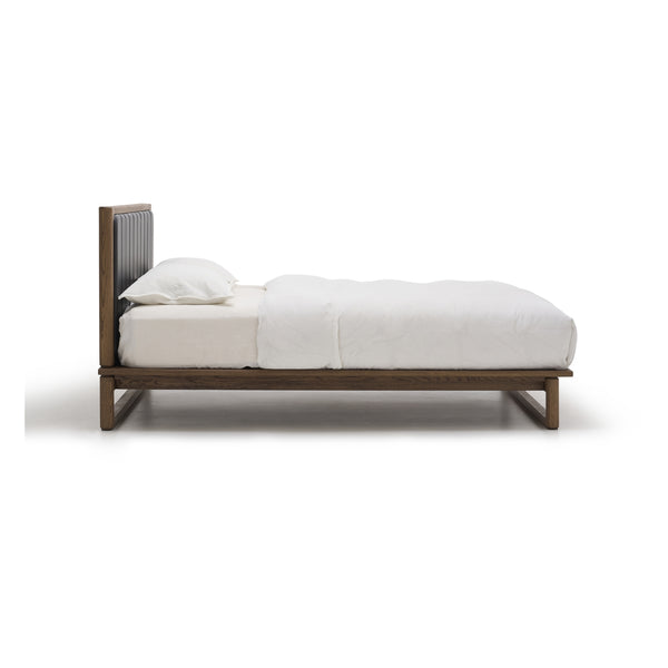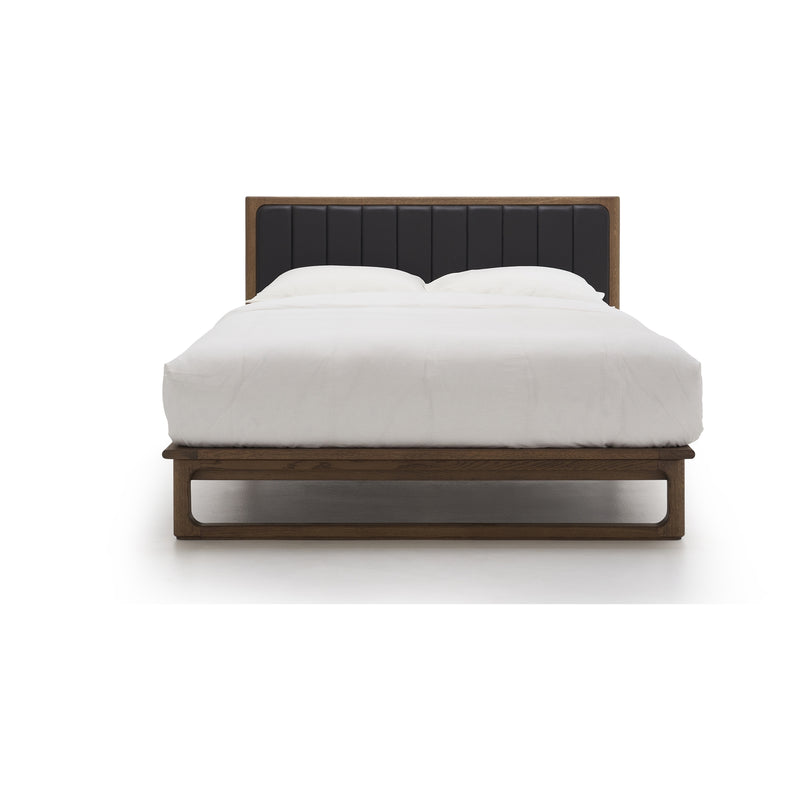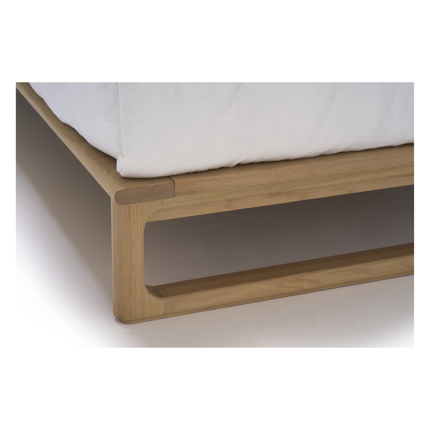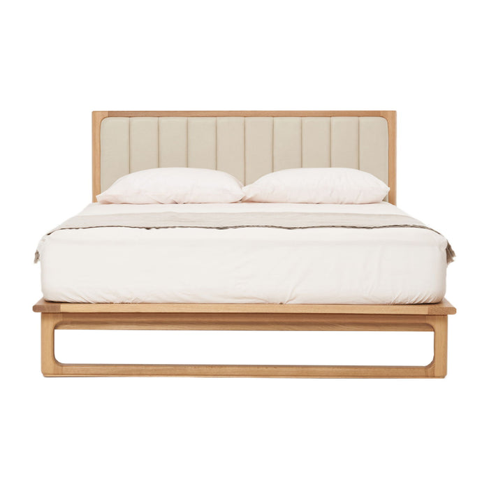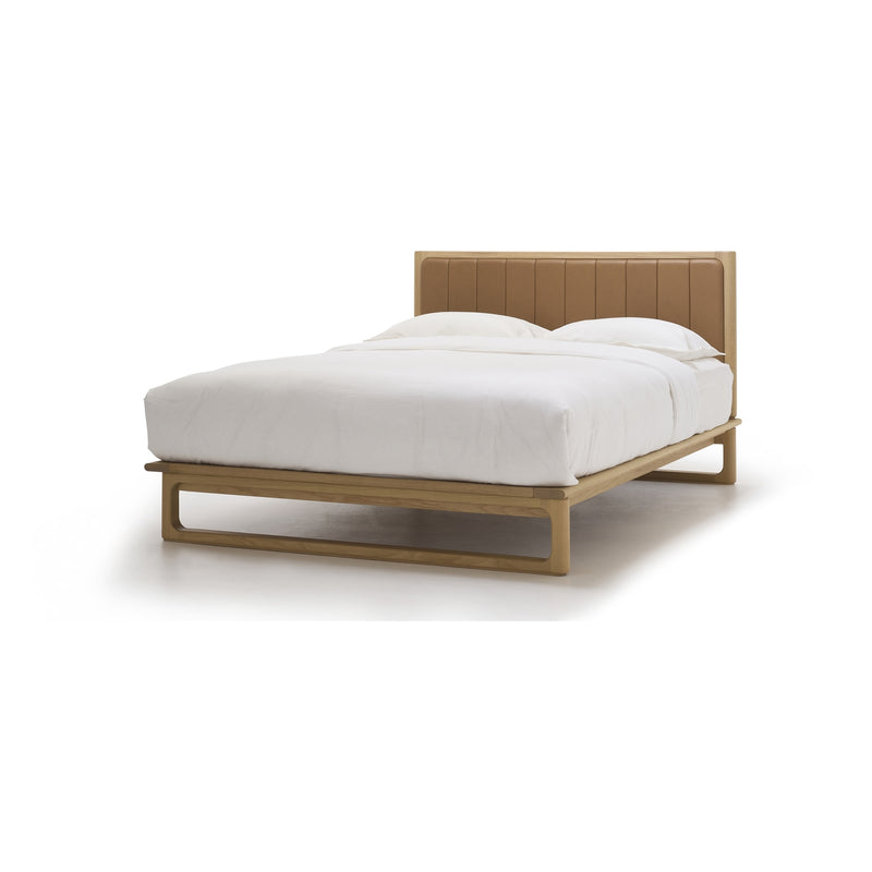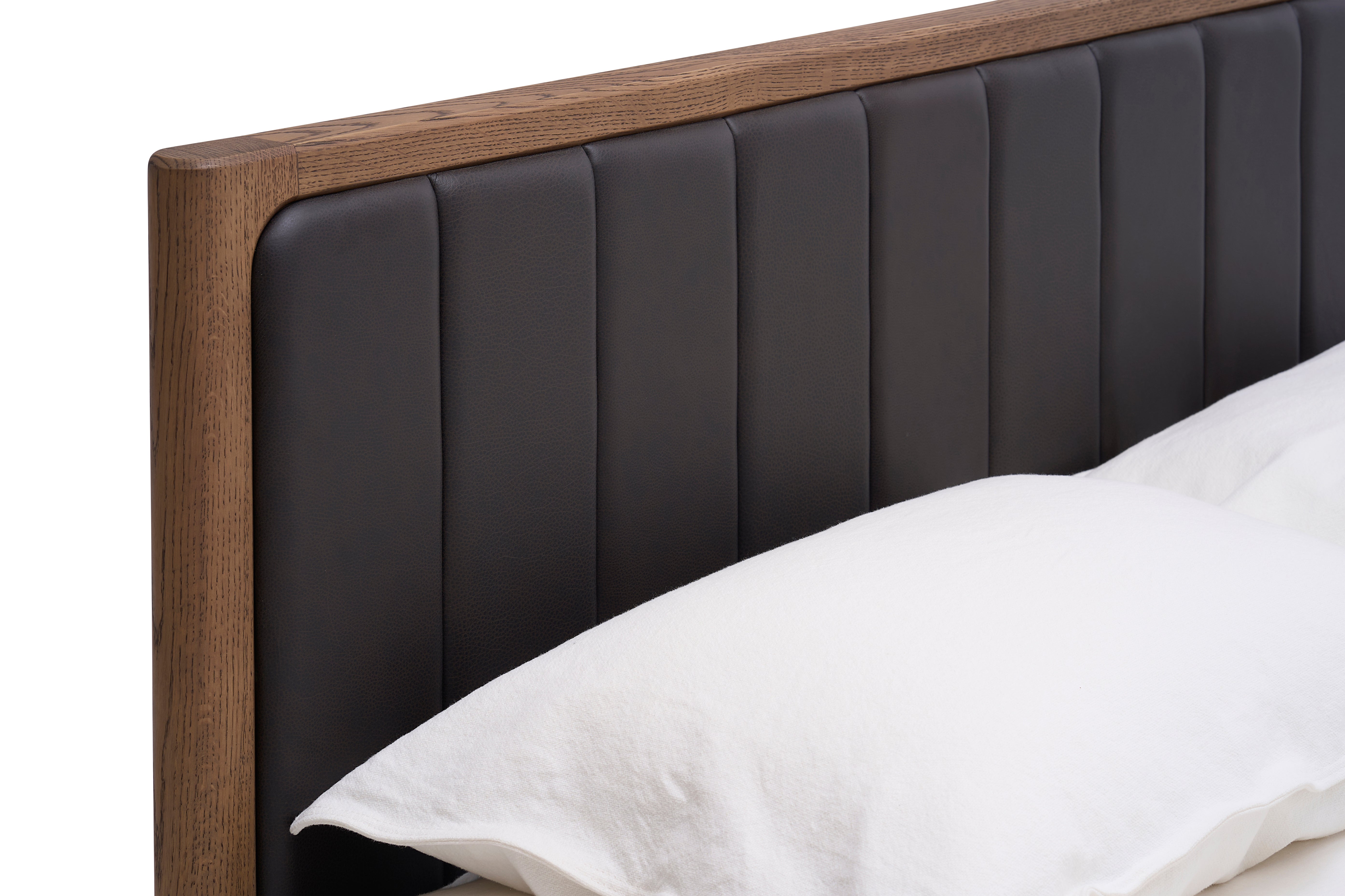 Hover Bed offers a thin minimalist bed base crafted from solid timber paired with a luxurious upholstered bed head. The mattress on top concept appears to float above the minimalist linear legs which are balanced by subtle curves and shadow lines.