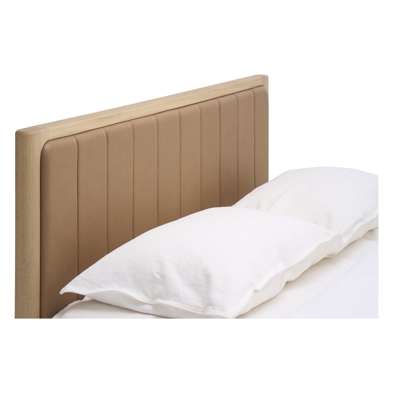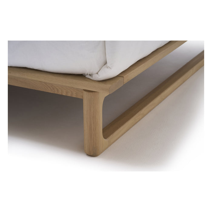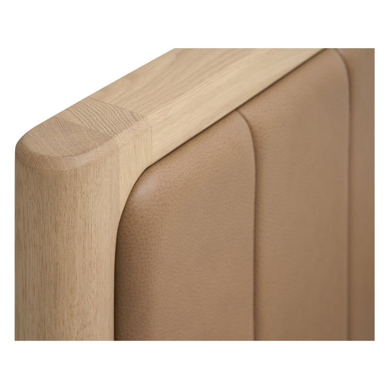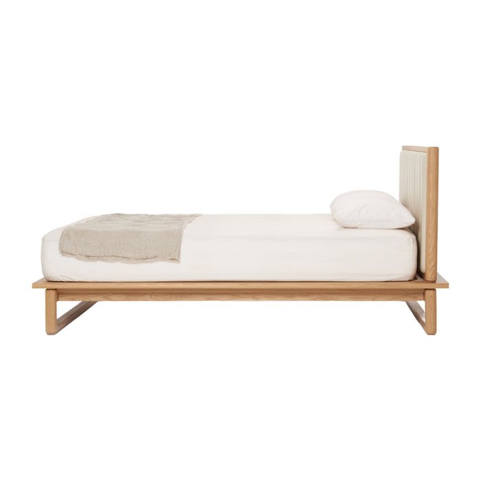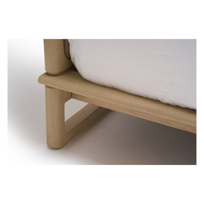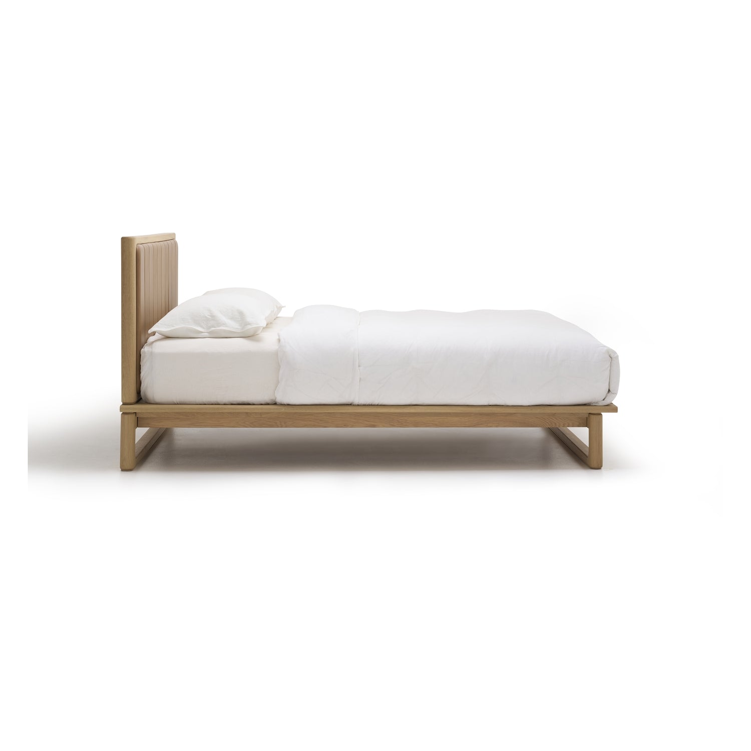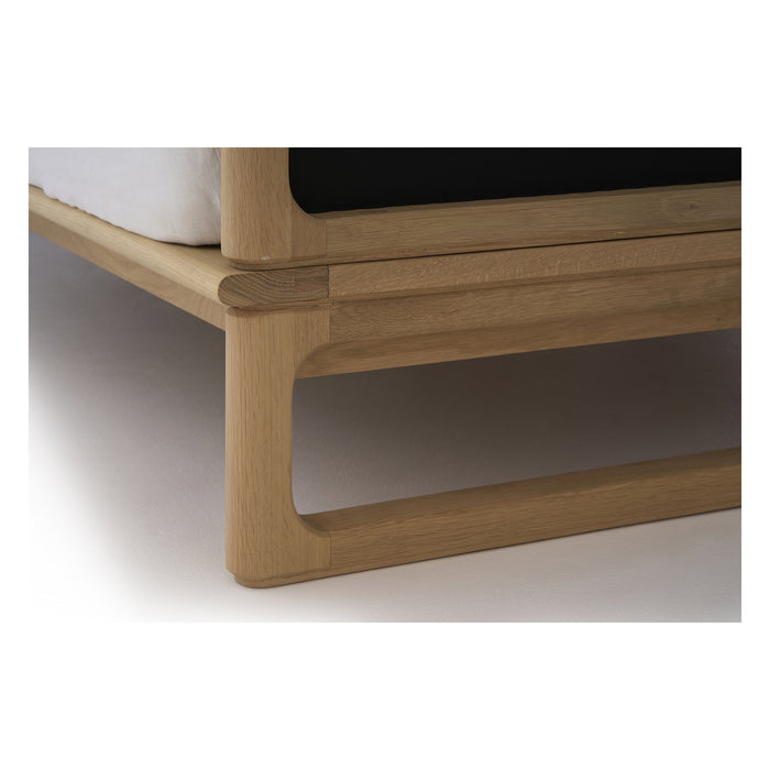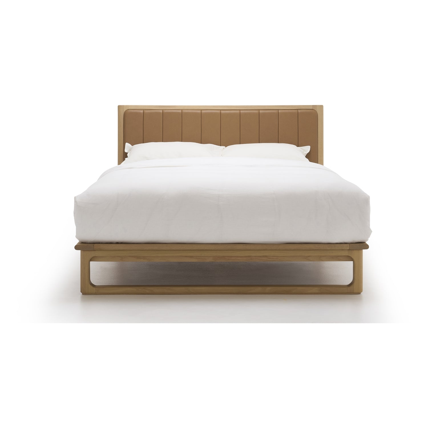 Hover Bed offers a thin minimalist bed base crafted from solid timber paired with a luxurious upholstered bed head. The mattress on top concept appears to float above the minimalist linear legs which are balanced by subtle curves and shadow lines.