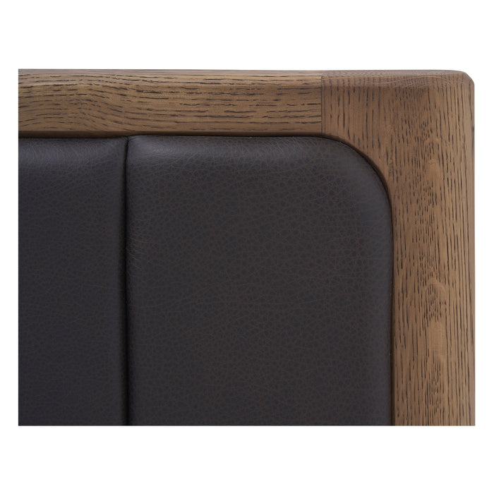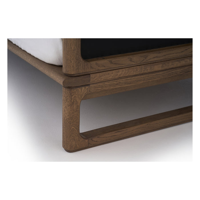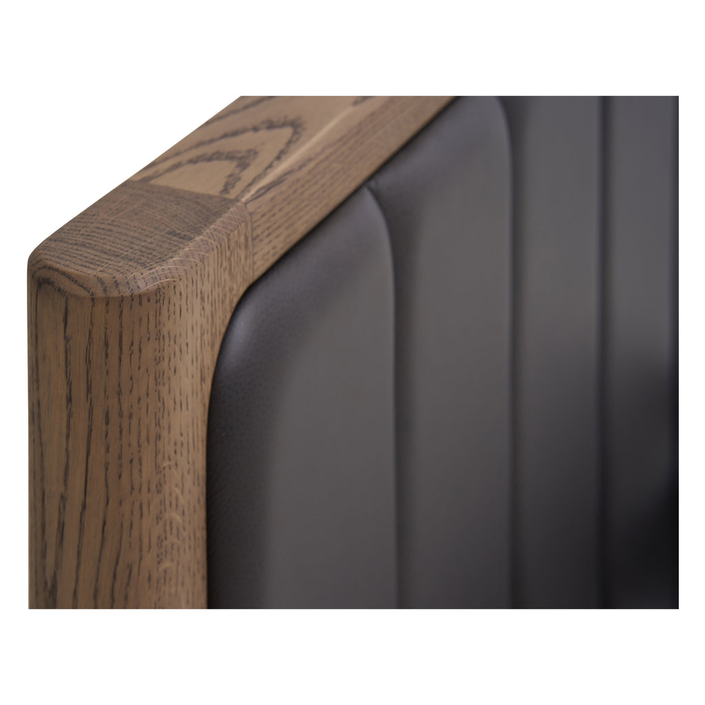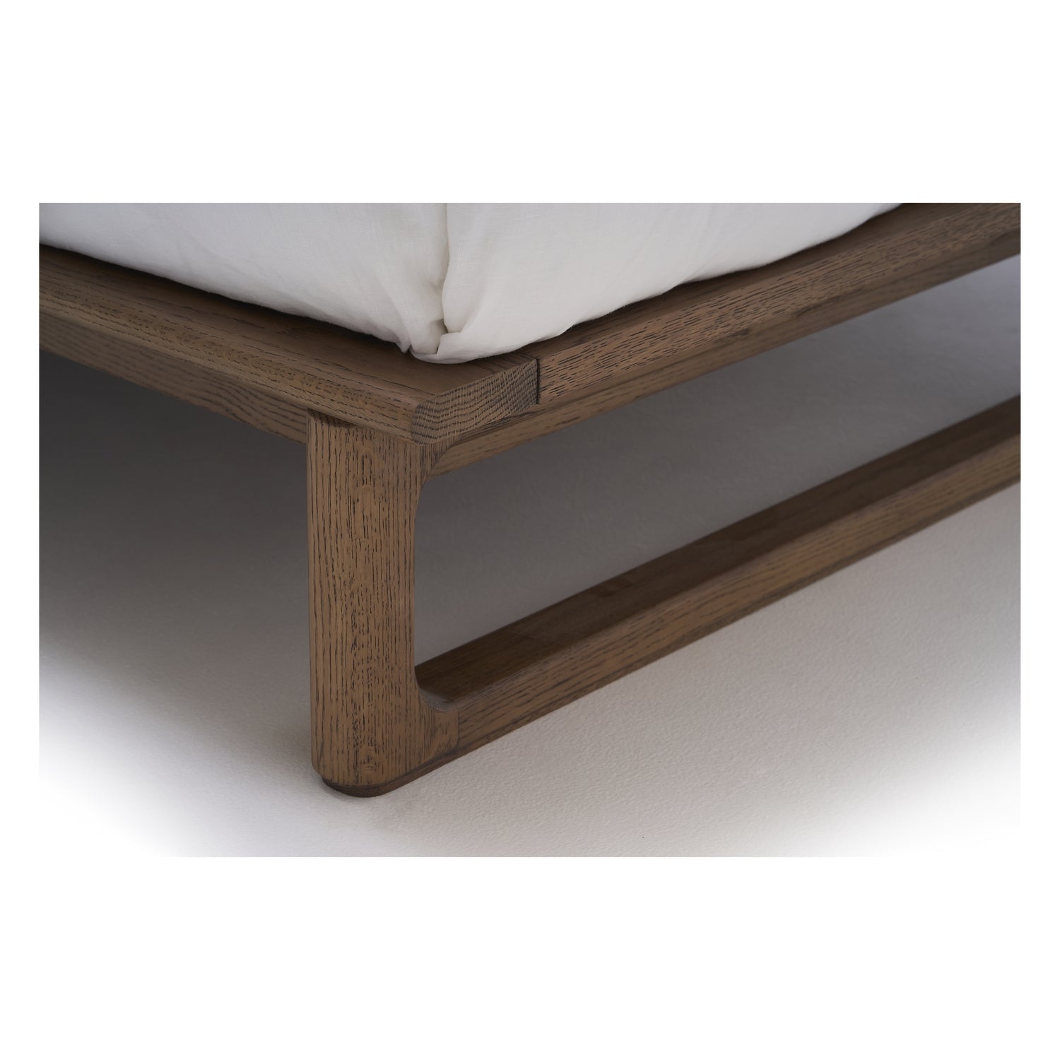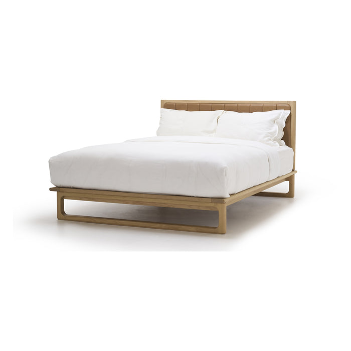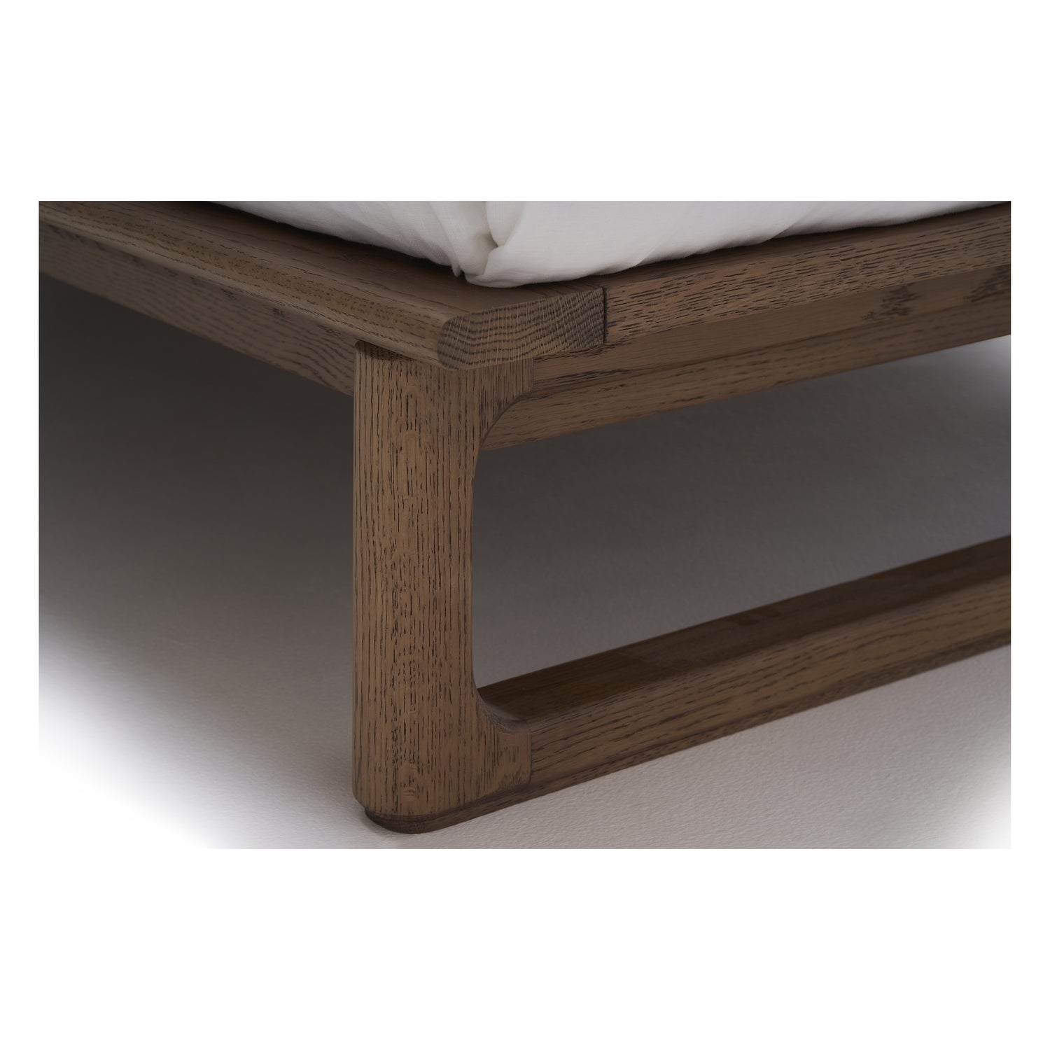Hover Bed offers a thin minimalist bed base crafted from solid timber paired with a luxurious upholstered bed head. The mattress on top concept appears to float above the minimalist linear legs which are balanced by subtle curves and shadow lines.