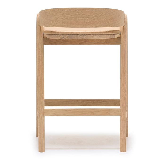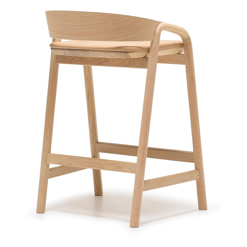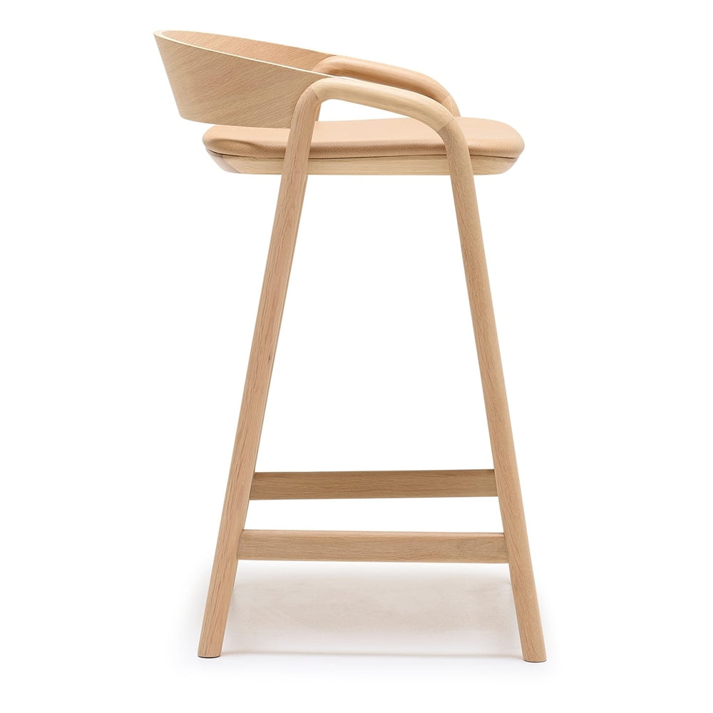 The design for Ryota Yokozeki’s Inlay counter stool comes from a desire to achieve new and challenging forms in wood while still showing respect for the material. Similar to an elegant letter form, the counter stool has a curving plywood backrest that merges seamlessly with the solid wood arms and frame.