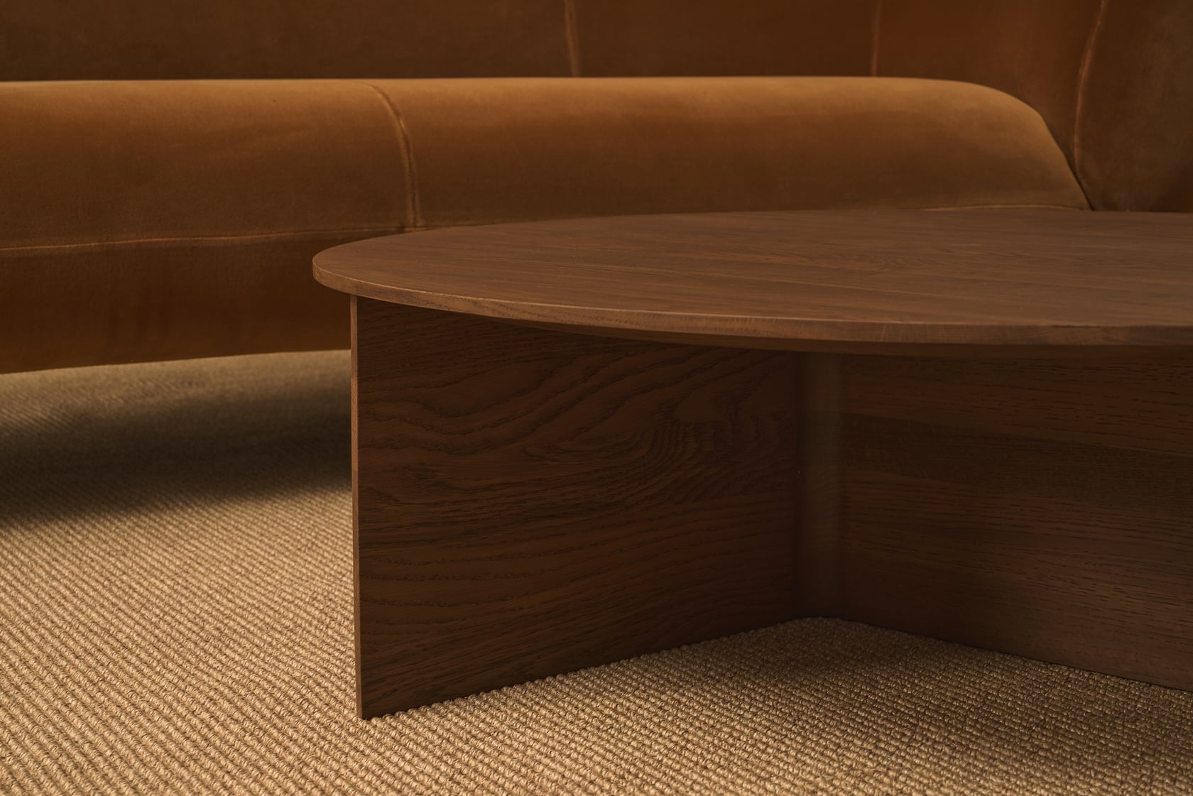 Solid timber panels in an understated T-shape form the base of the Jaunt table. Subtle and harmonious changes in the thickness of the panels, chunky at the centre and tapering out to a narrow gauge at the edge, provide an almost imperceptible dynamism, echoed by the tapered edge of the table top, which can be solid wood, natural stone or glass.
