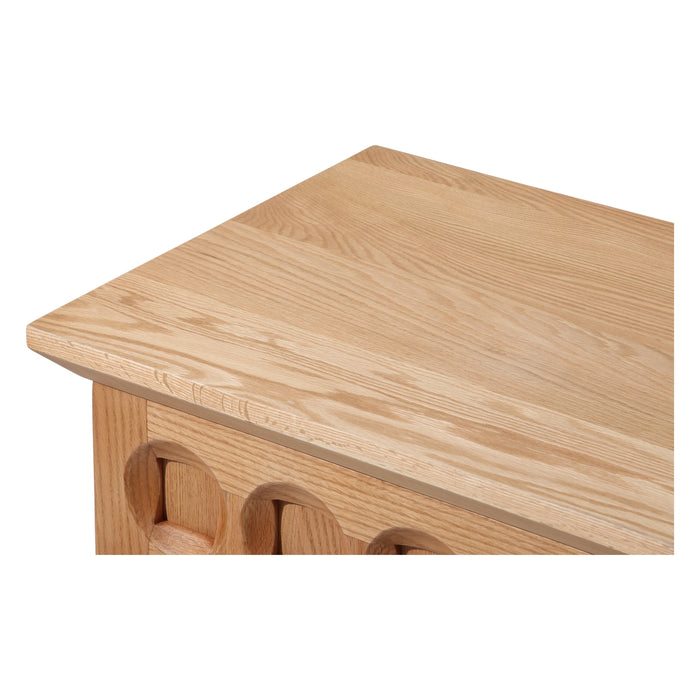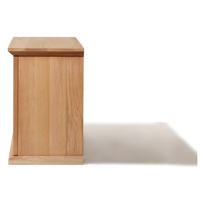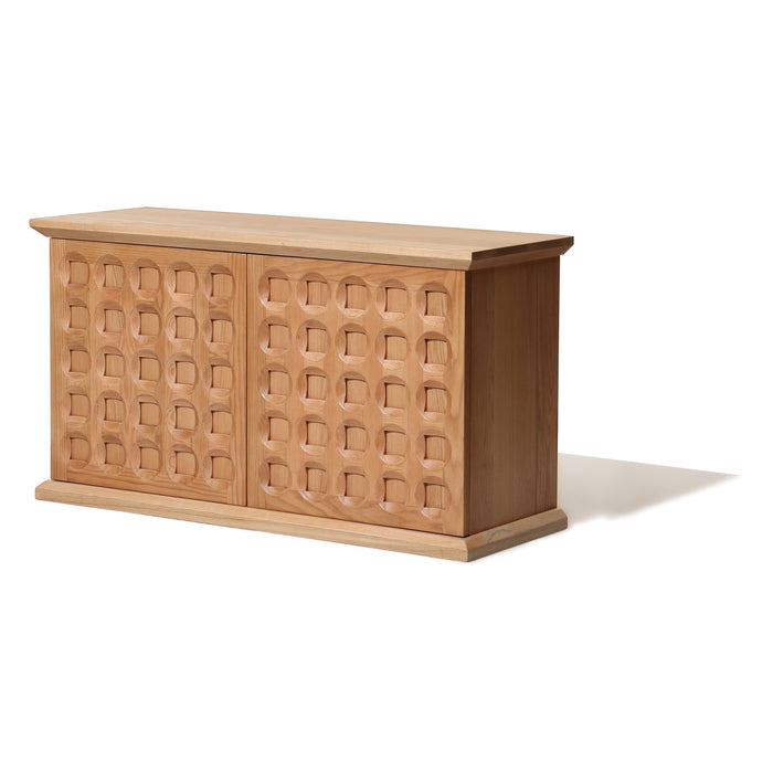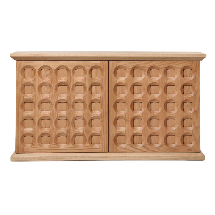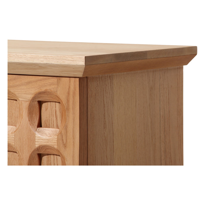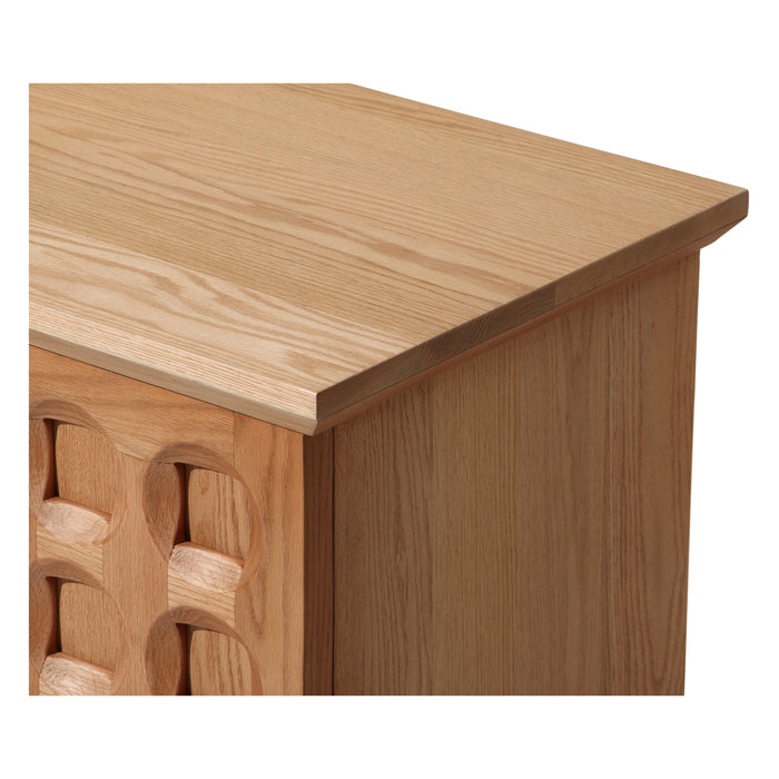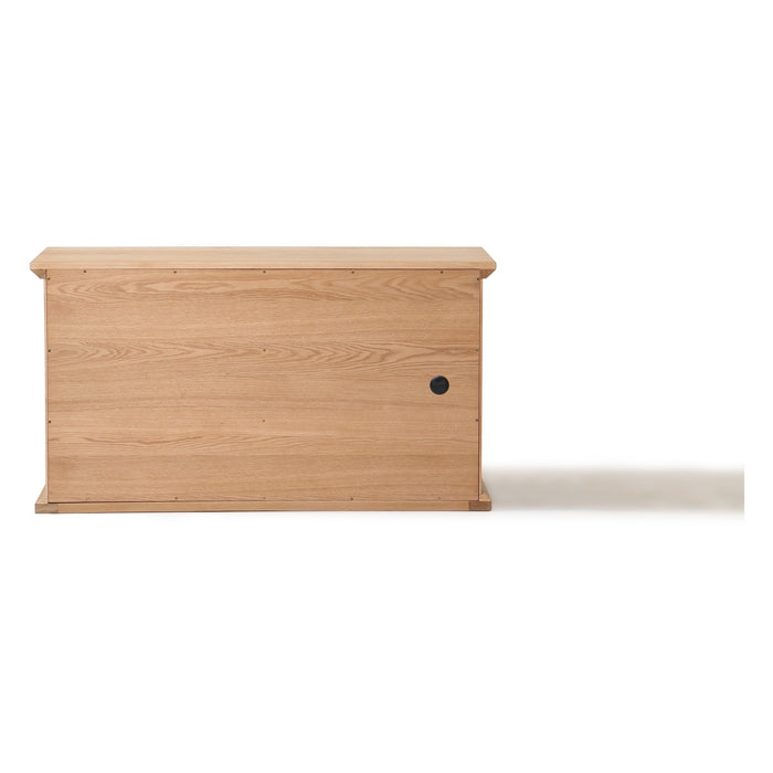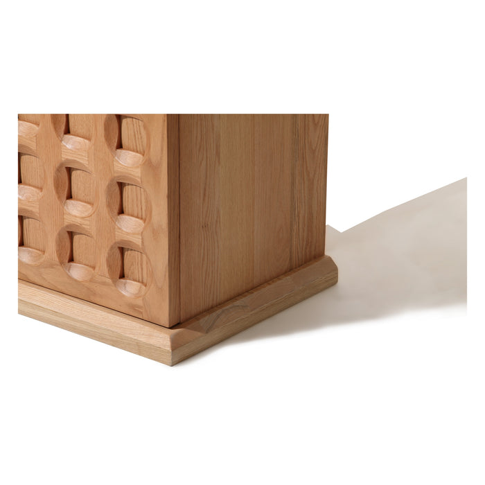 Expertly crafted with a bleached oak wood top and bottom, the Leya Cabinet combines sophistication and durability. Its smoky brown oak body and veneer rubber wood shelves provide ample storage space, while the veneer plywood door and cabinet back add to its sturdy construction. Elevate your space with this beautiful and functional piece.