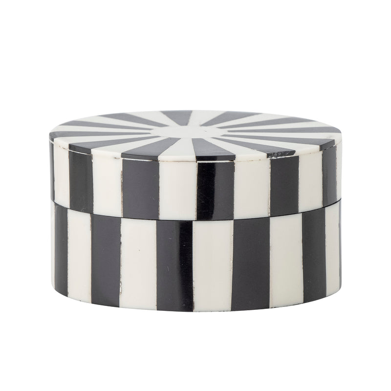 The Ilana Box w/Lid by Bloomingville is a little round box made of resin decorated with a black and off-white striped pattern. Perfect for display and for storing jewelry or small items in the home office.