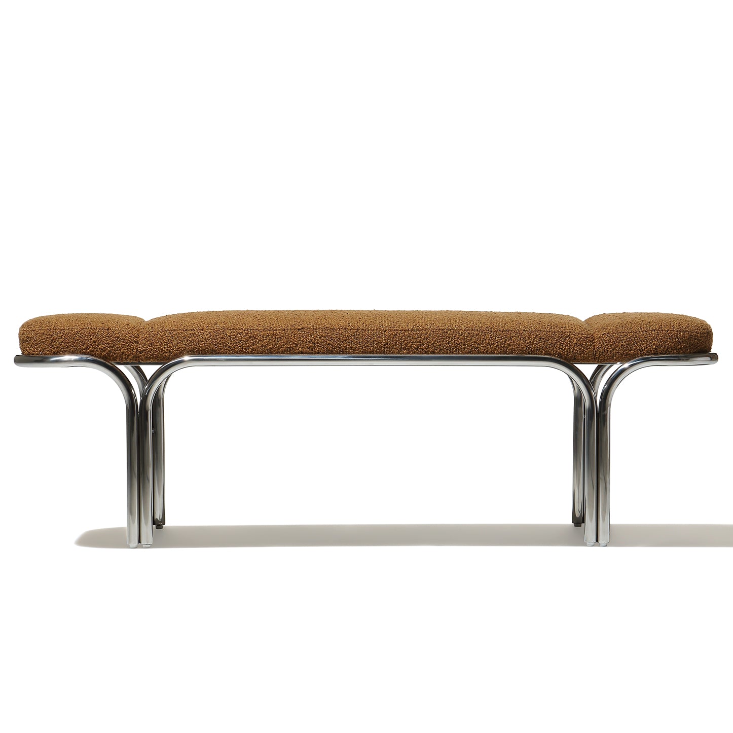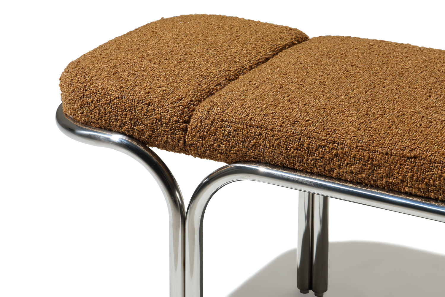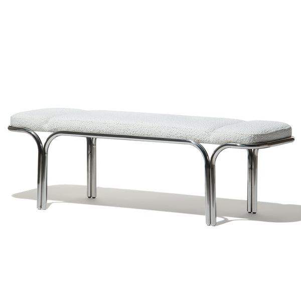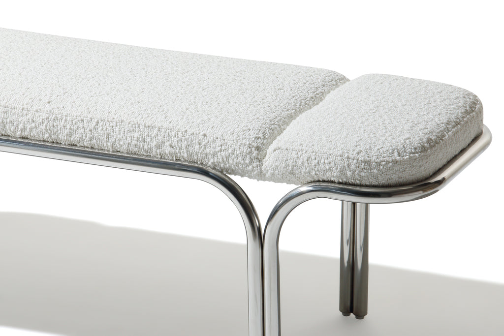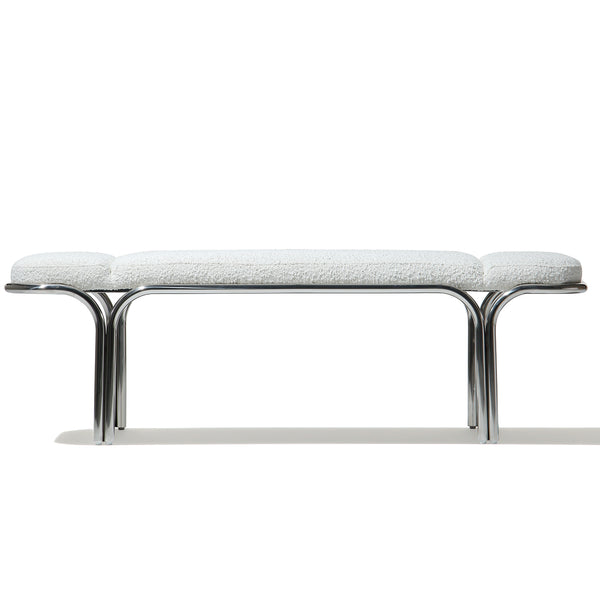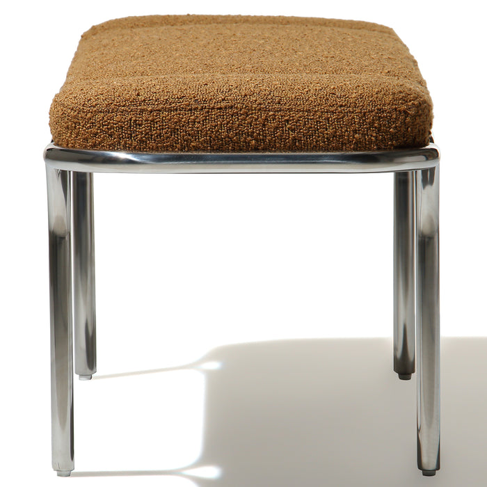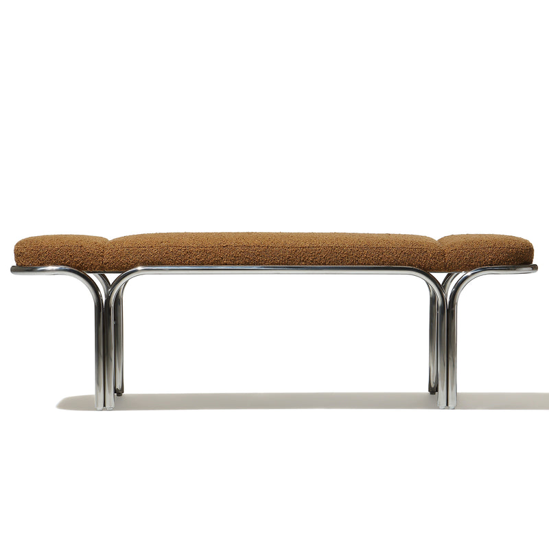 Small hallway / entrance way bench with distinctive archway stainless steel frame. 3 floating seat pads to reflect the archways. Upholserted in beautiful boucle fabric or leather, this bench is a stunning piece that is very comfy to sit upon.