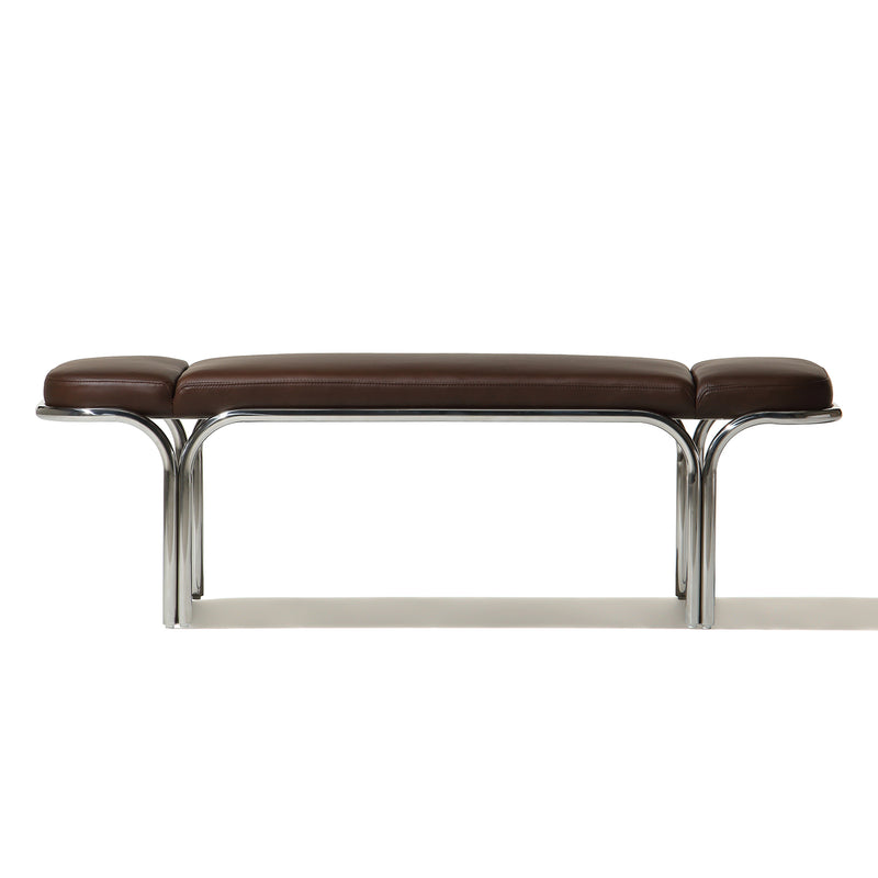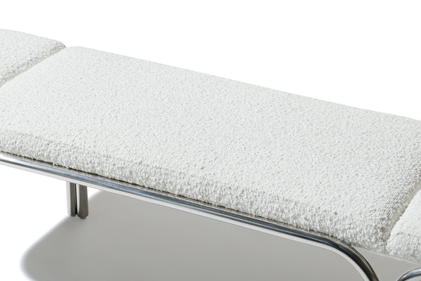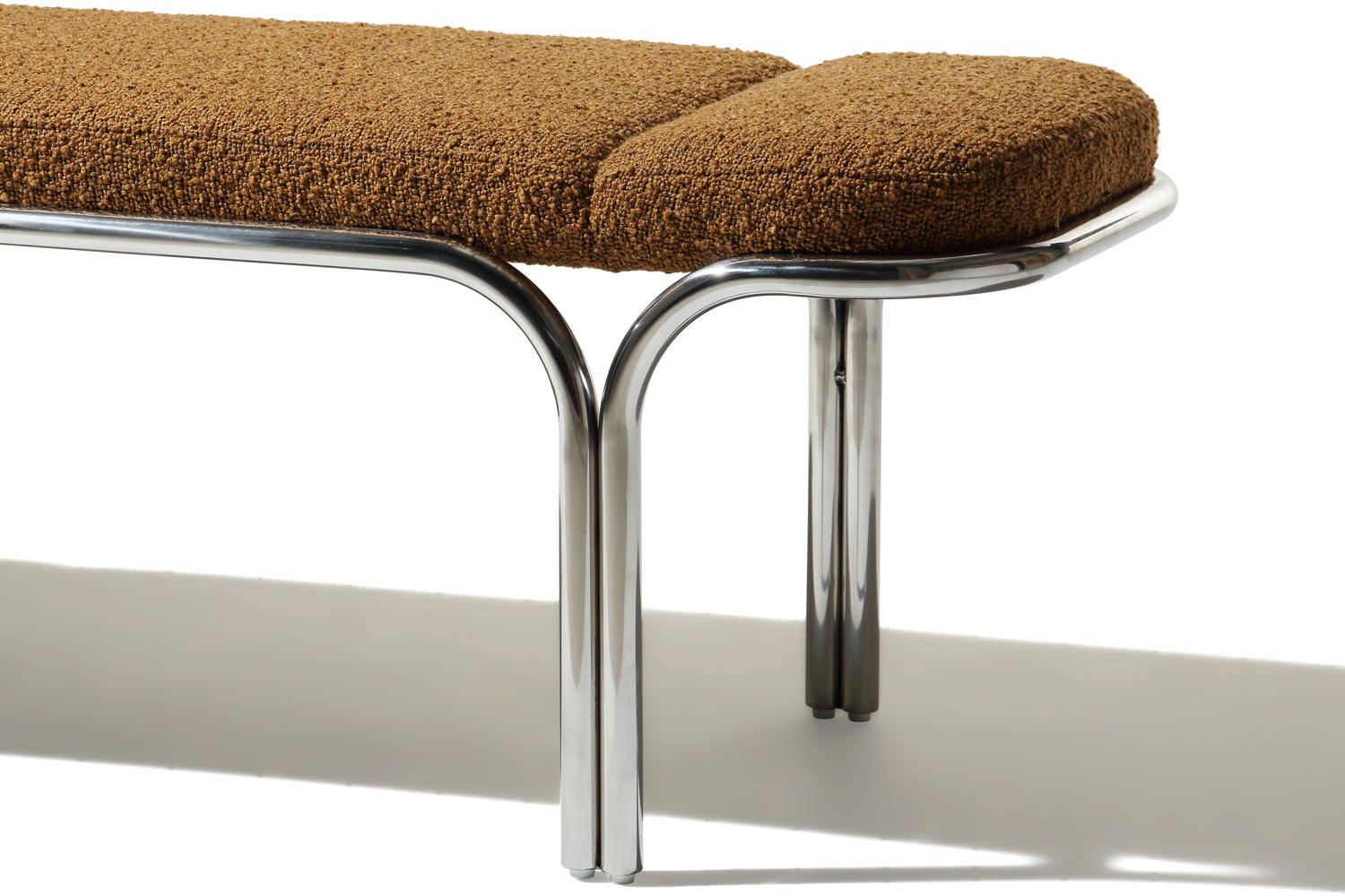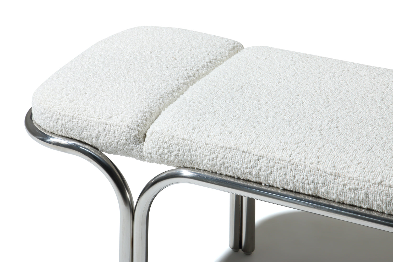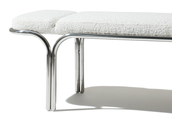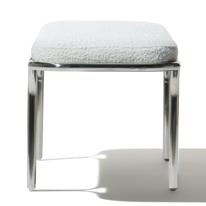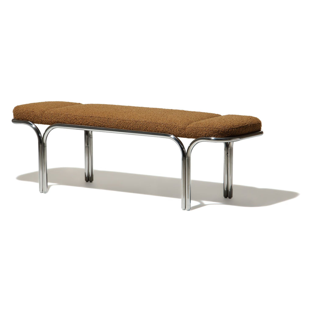 Small hallway / entrance way bench with distinctive archway stainless steel frame. 3 floating seat pads to reflect the archways. Upholserted in beautiful boucle fabric or leather, this bench is a stunning piece that is very comfy to sit upon.