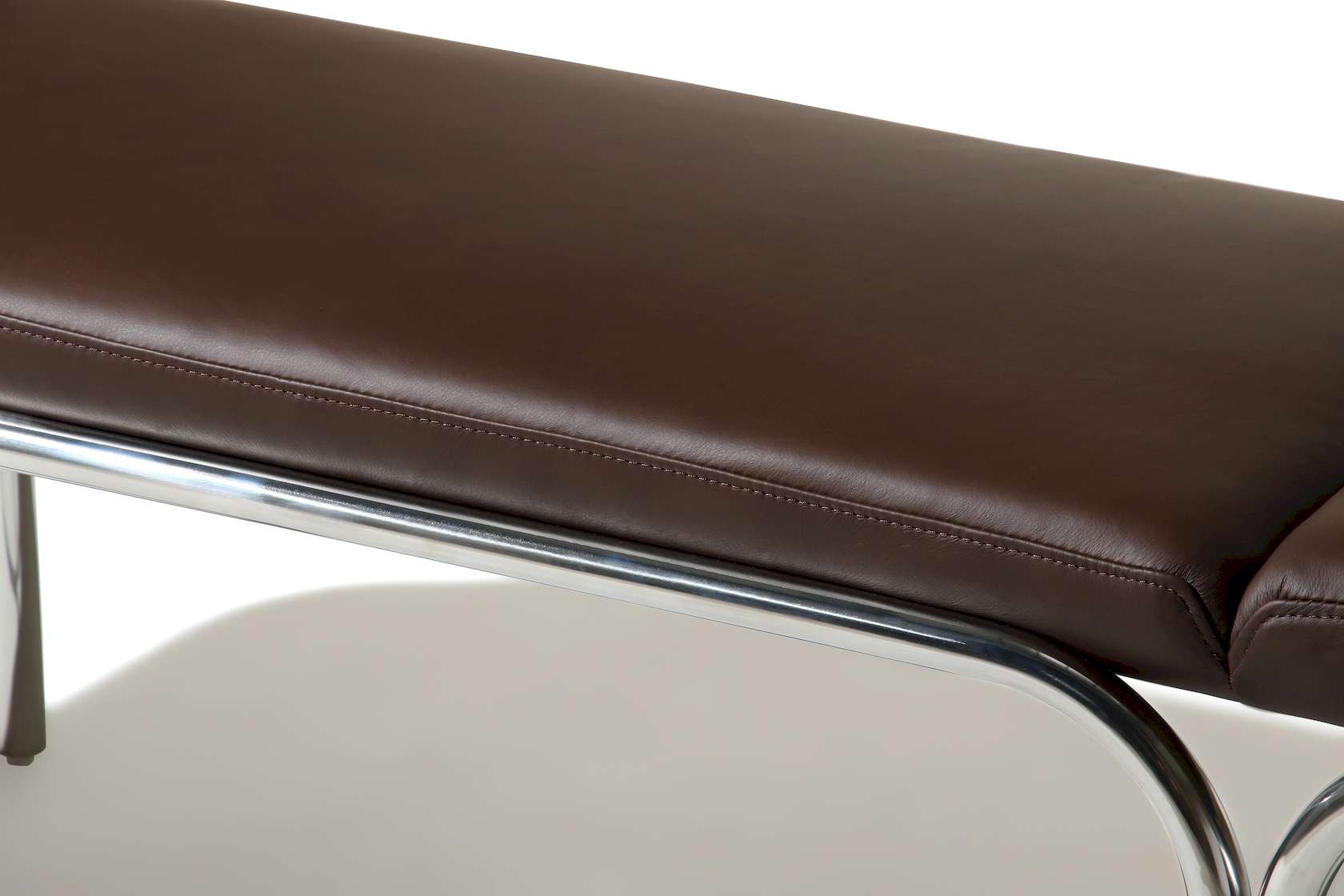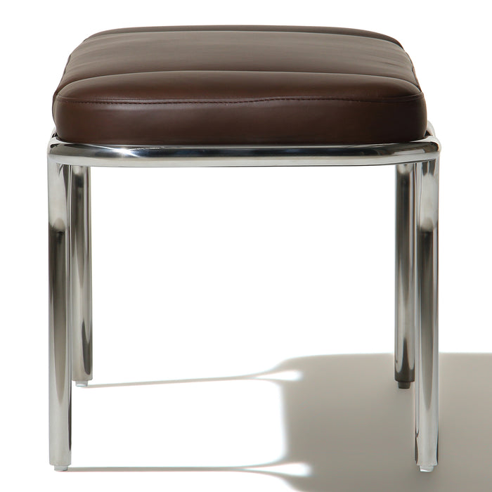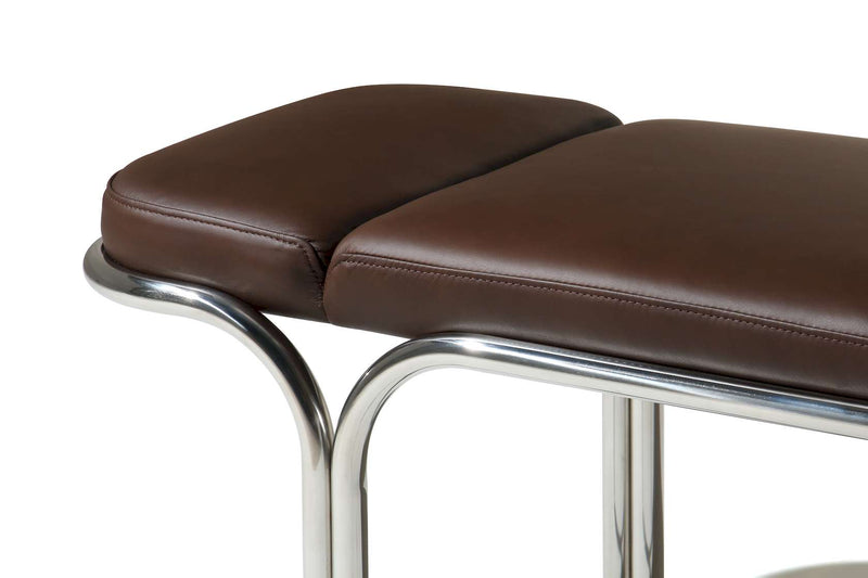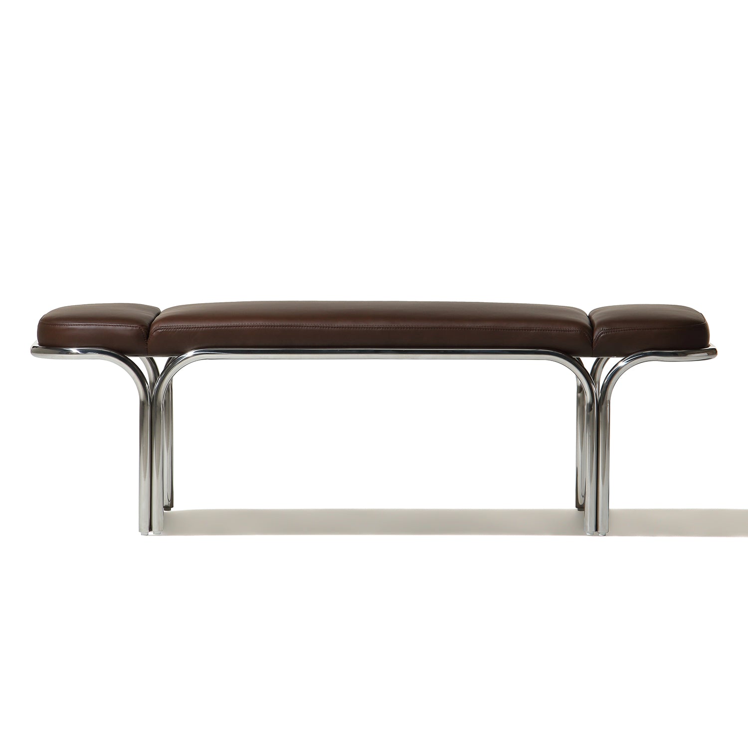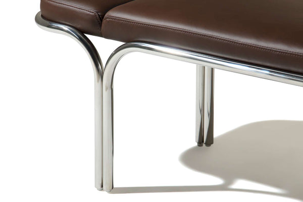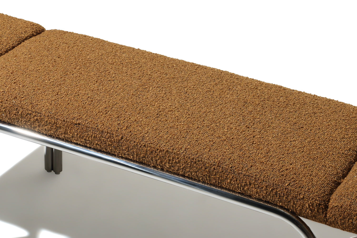Small hallway / entrance way bench with distinctive archway stainless steel frame. 3 floating seat pads to reflect the archways. Upholserted in beautiful boucle fabric or leather, this bench is a stunning piece that is very comfy to sit upon.