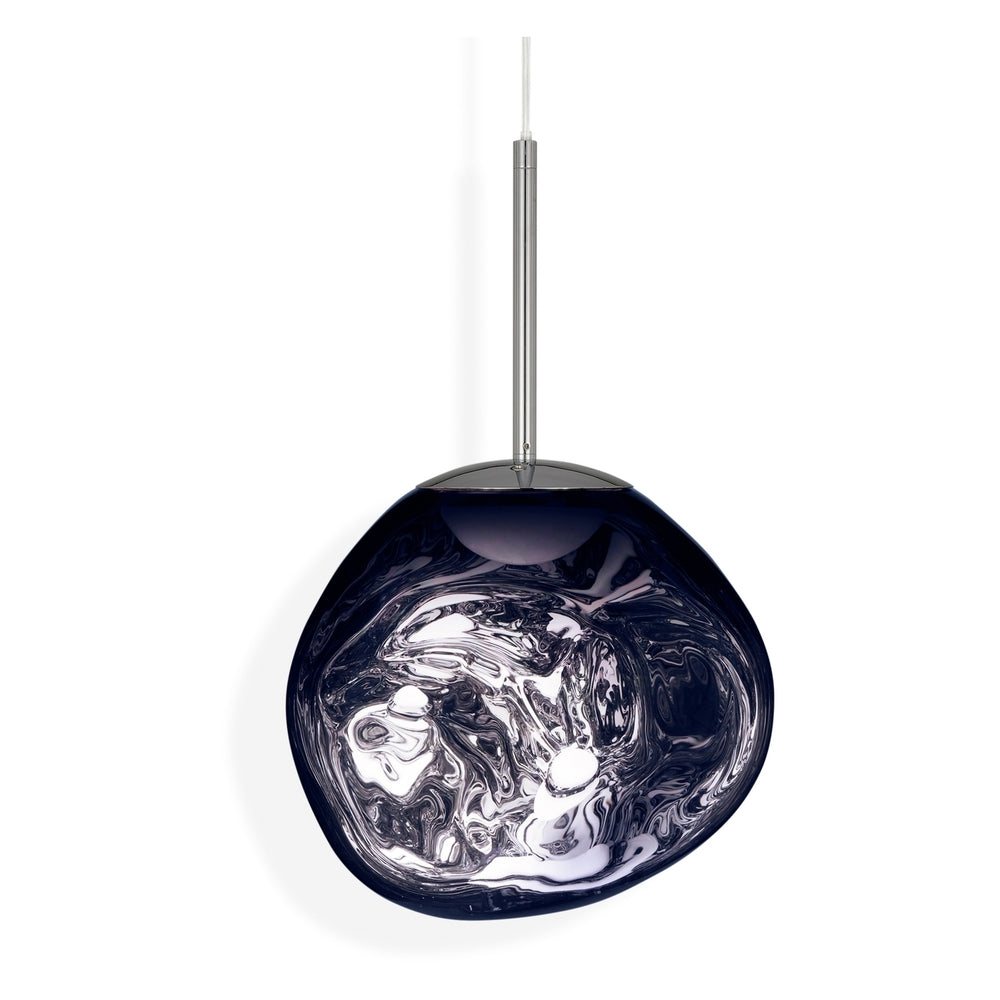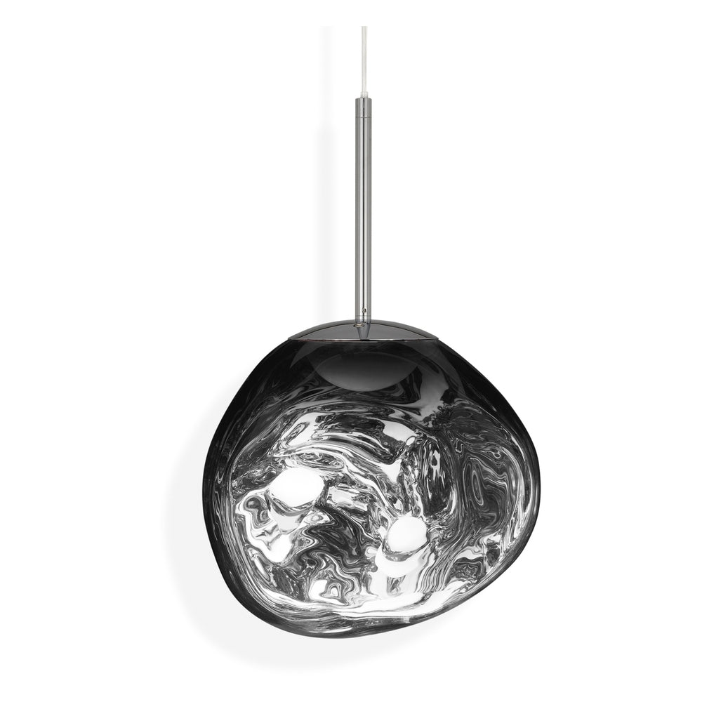 Melt Mini is a beautifully distorted small pendant in a modern Chrome finish and matching ceiling rose. Featuring our intergrated LED module, this ceiling light creates a mesmerizing melting hot-blown glass effect when on and a mirror-finish effect when off. Made in Germany using a high tech manufacturing technique to achieve the perfect melted orb.