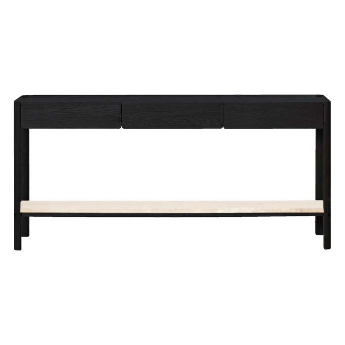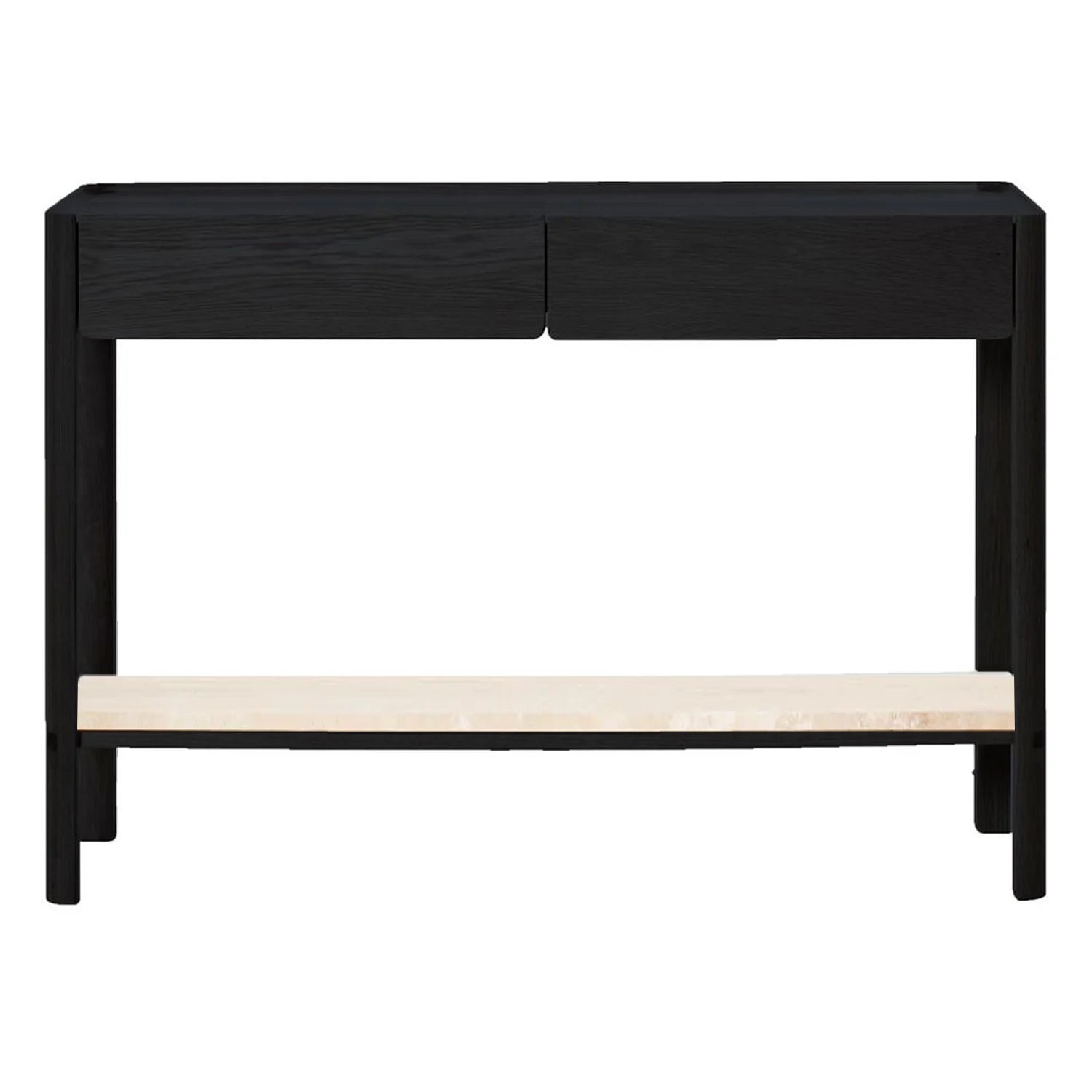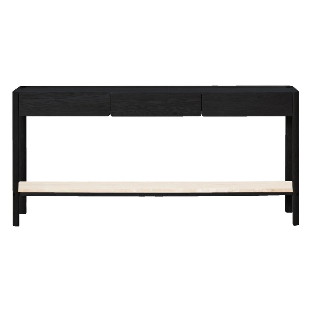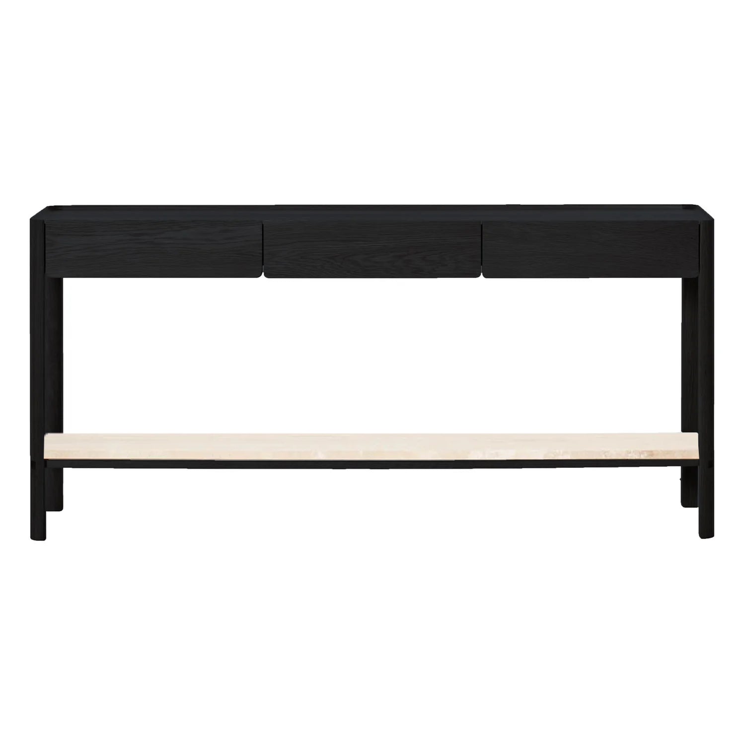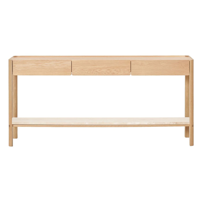 Nell Console is a composition of harmonious details that together form a unique statement piece. Each element invites attention and tactile interaction. The scalloped top shelf provides a safe storage surface, while the front edge opens convenient drawers. Braced with a marble or timber shelf. Nell is a celebration of authentic materials, craft and timeless architectural forms.