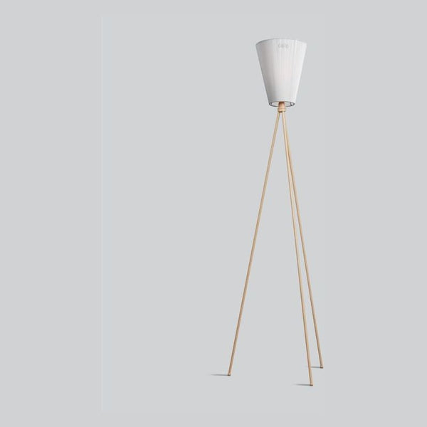 Oslo Wood Floor Lamp by Northern is a trendy light with a tripod base and multi-directional shade. The shade rotates around a gimbal fastened to the top of the tripod, giving it the potential to angle light in any direction. The cloth shade projects light upward, yet also diffuses it through the fabric to create a soft glow.