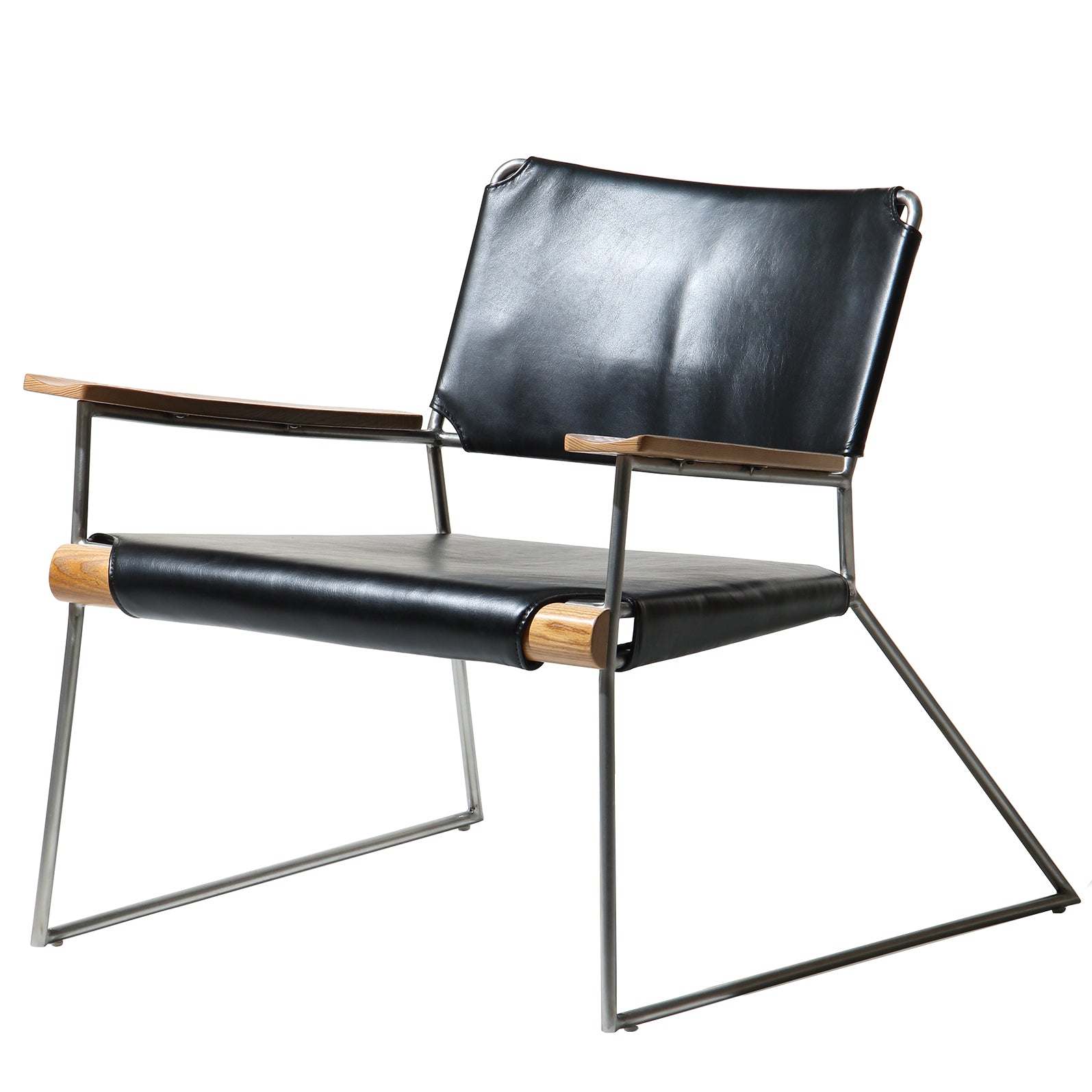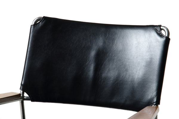 Outlaw-Thinking of an outlaw we came up with this occasional chair, distressed and rugged black metal exterior, complimented with our vintage leathers and formed solid oak wood arms. Thick detail stitching along the backside edge brings up thoughts of the cowboy lifestyle.