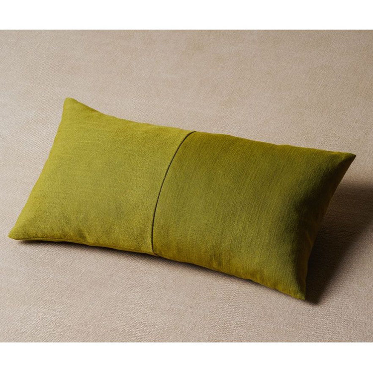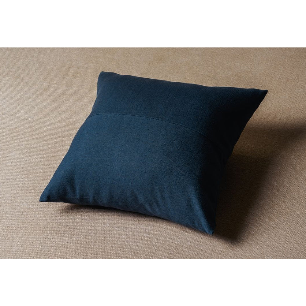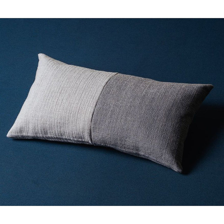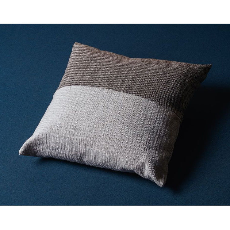 A subtle line separates the surface of the Papa cushion into two halves. On the monotone version, the difference is achieved by rotating the fabric on one half of the cushion perpendicular to the other. Simply altering the direction of the weave creates a change that reflects how each half catches the light. The two-tone version offers a more definitive contrast.