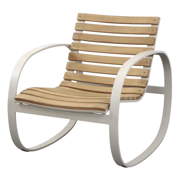 Parc rocking chair is a refined and exclusive chair of design furniture in teak designed by the Danish designduo Foersom & Hiort-Lorenzen MDD. The chair is "bodyfitted" so it follows the shape of the body and gives an extremely high comfort. The Parc series is suitable for both small as well as large outdoor spaces due to its different design options, from bench to rocking chair and dining chairs. Parc will fit any space due to its choice of natural material and its exclusive design. Parc is produced in certified teak and powdercoated aluminium which ensure a resistant surface.