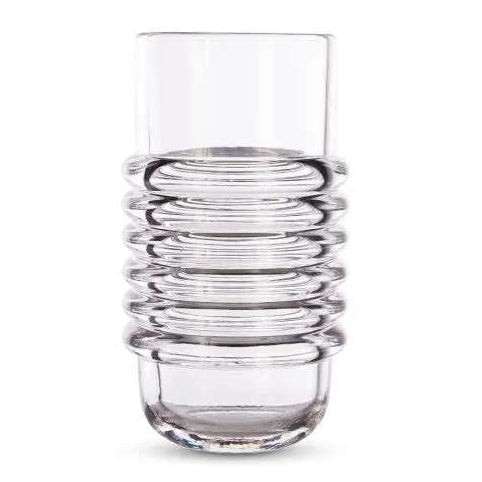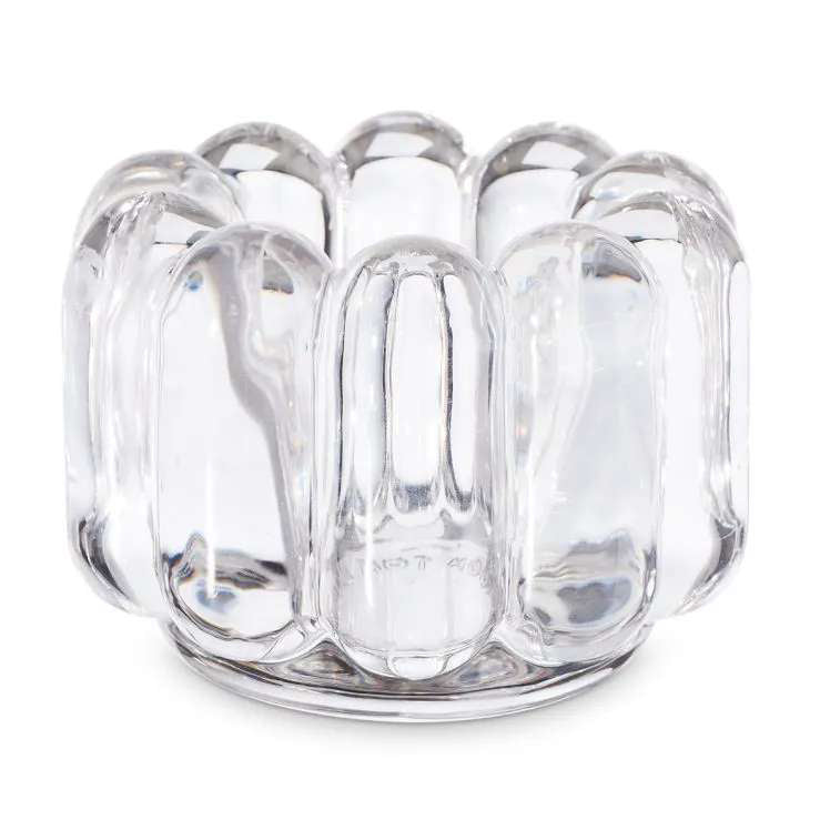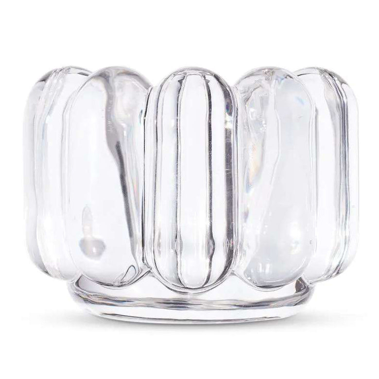 Press is a vertical tealight holder, designed and engineered to catch and refract light, and to last for ever. This heavyweight grooved candleholder is made of fat, chunky coils of pure and clear transparent glass. Bold in silhouette and simple in function, it is manufactured by dropping big globs of molten glass at 1,200 degrees centigrade and pressed in two or three part iron moulds to create the immediately familiar silhouette.