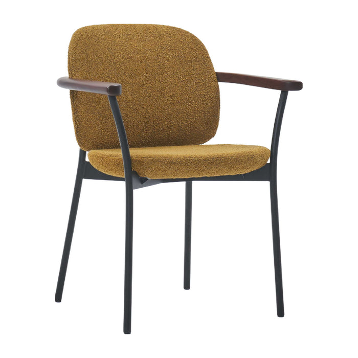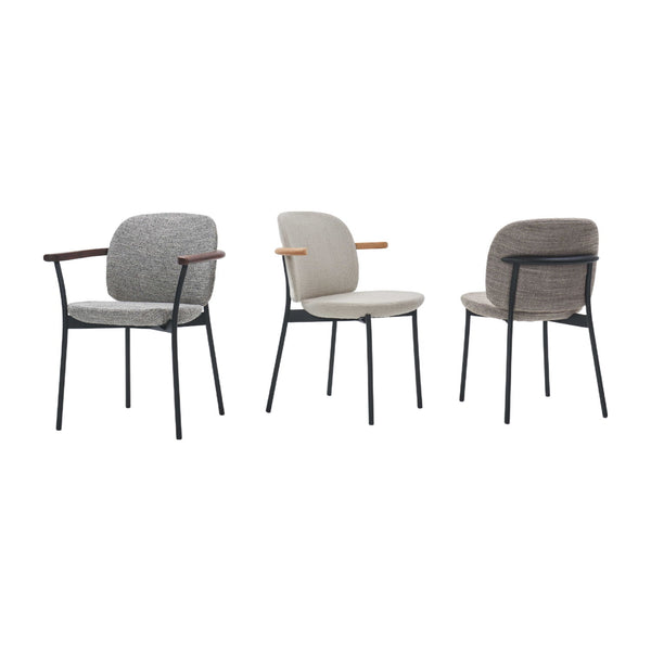 The Solace chair family is reflective of a place of comfort, security and warmth. With a generous upholstered seat and back, Solace offers outstanding comfort at the dining table, encouraging prolonged gatherings with family and friends. Its premium powder coated steel frame guarantees the strength and longevity of this timeless design. Premium touch points such as the wraparound armrests are crafted from solid wood, with thouhtful details such as the hidden pull handle which prevents repeated handling of the upholstery. Solace was designed to last generations and delight its users with surprising details, comfort, premium material selection and strength.