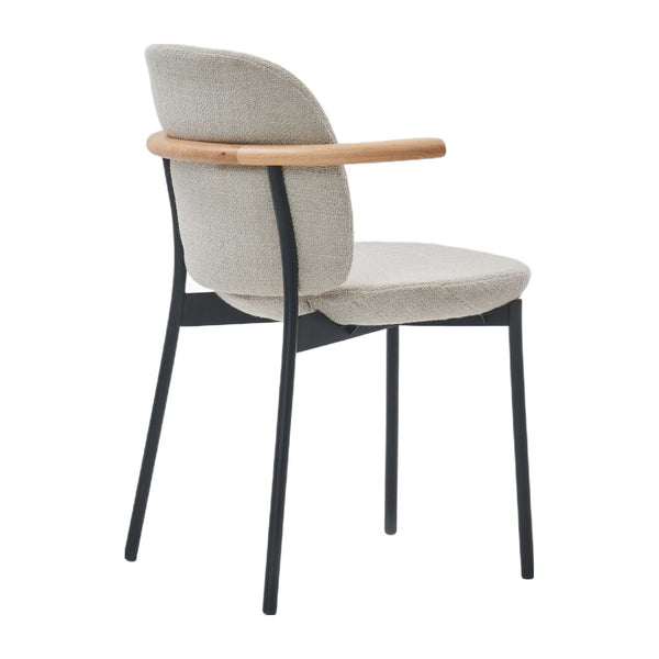 The Solace chair family is reflective of a place of comfort, security and warmth. With a generous upholstered seat and back, Solace offers outstanding comfort at the dining table, encouraging prolonged gatherings with family and friends. Its premium powder coated steel frame guarantees the strength and longevity of this timeless design. Premium touch points such as the wraparound armrests are crafted from solid wood, with thouhtful details such as the hidden pull handle which prevents repeated handling of the upholstery. Solace was designed to last generations and delight its users with surprising details, comfort, premium material selection and strength.