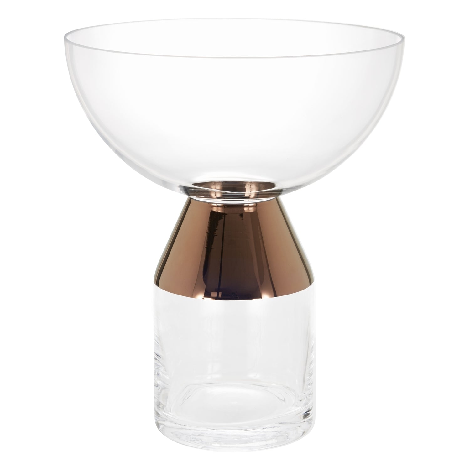 A large mouth-blown clear glass vase ornamented with hand-painted copper detailing. The generously proportioned vase is perfect for a large bouquet of flowers and designed to create a striking centerpiece. Handmade in Poland, this Tank vase takes its sculptural cue from the functional shapes and volumes of scientific glassware.