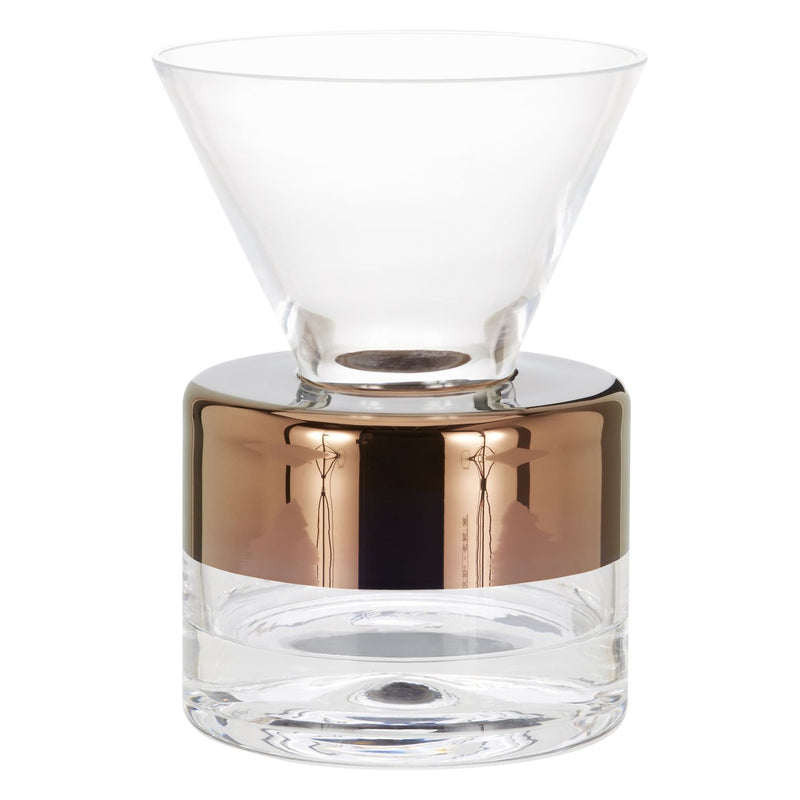 A medium-sized mouth-blown clear glass vase ornamented with hand-painted copper detailing. The generously proportioned vase is perfect for a small bouquet of flowers and designed to create a striking centerpiece. Handmade in Poland, This Tank vase takes its sculptural cue from the functional shapes and volumes of scientific glassware.