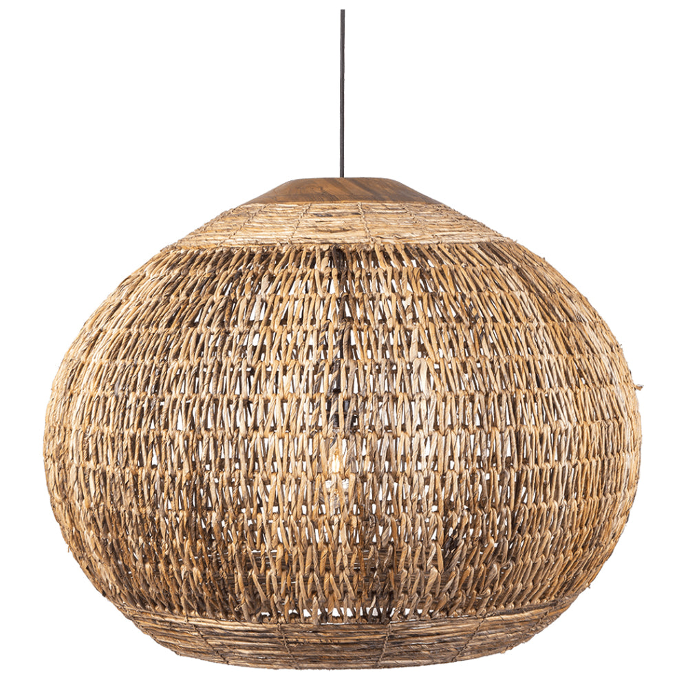 Tumbler Wing Lampshades are created using an open bottomed metal ball framework and masterly wrapped in Abaca bark to create a bolder more rustic weave appearance, the lamps are then topped with a crest of hand turned reclaimed teak. Casting a beautiful lattice glow upon surfaces and walls, an eye-catching embellishment to rooms of any style.