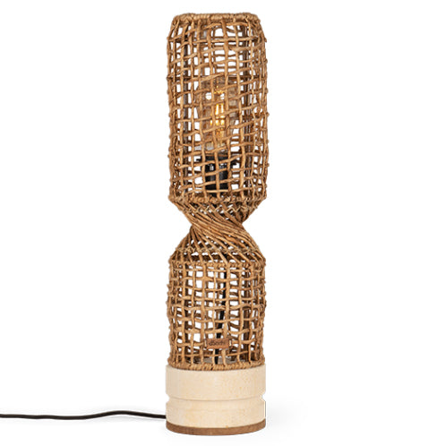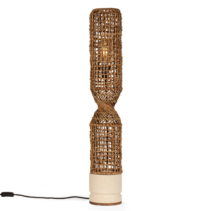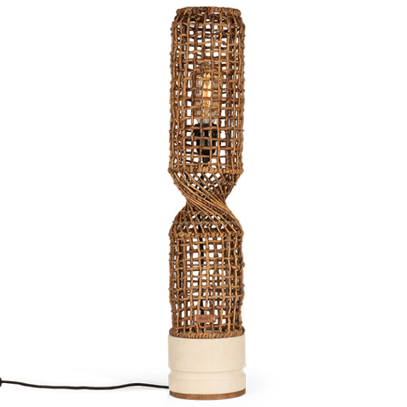 Twister Table Lampshades are freestanding table lamps fashioned in a ‘fish trap’ design using a metal framework and masterly wrapped in Abaca bark to create a rustic and pleasing weave appearance, the lamps are then pinched and twisted revealing stylish “twist detailing’ and sat upon a solid, hand turned sand stone base, providing both stability and safety.